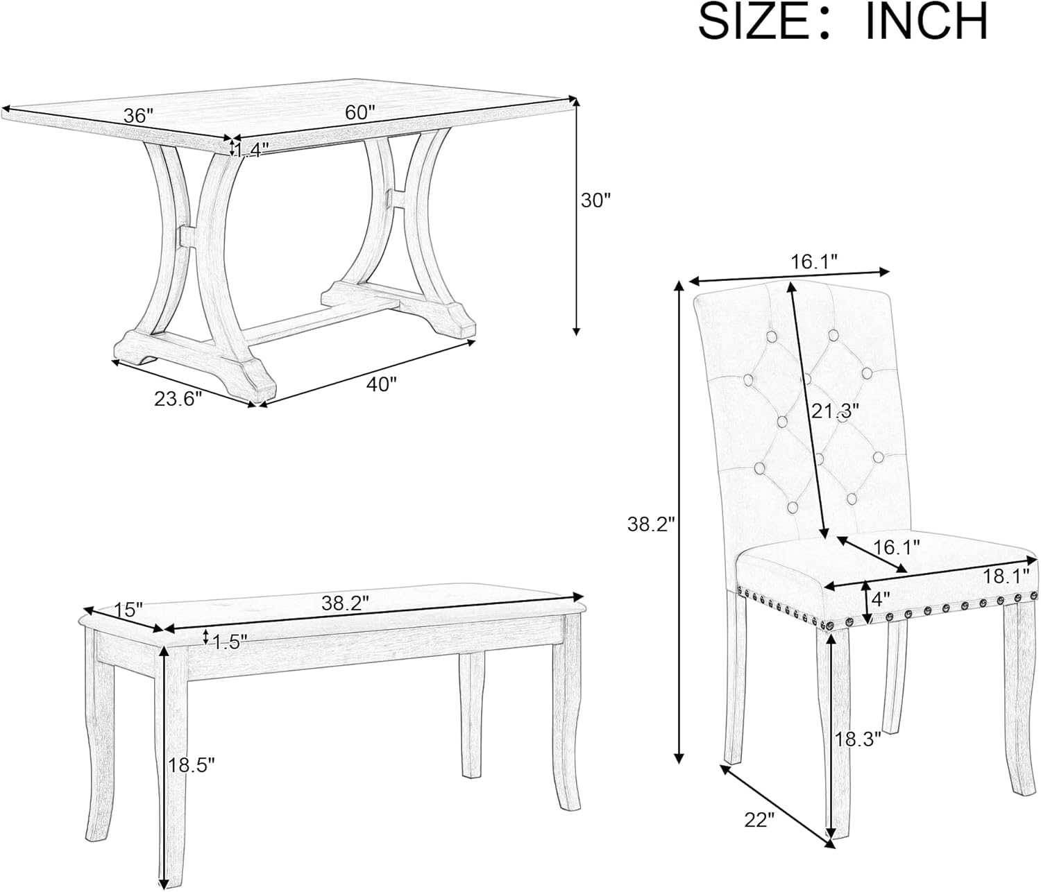 - 【Easy Assembly】 Full assembly required. The dining set comes with detailed instructions, and it can be installed step by step following the instructions, which can help you complete the assembly as soon as possible. Table: 60"L x 36"W x 30"H, Chair: 18.1"L x 22"W x 38.2"H,Bench: 38.2"L x 15"W x 18.5"H.
