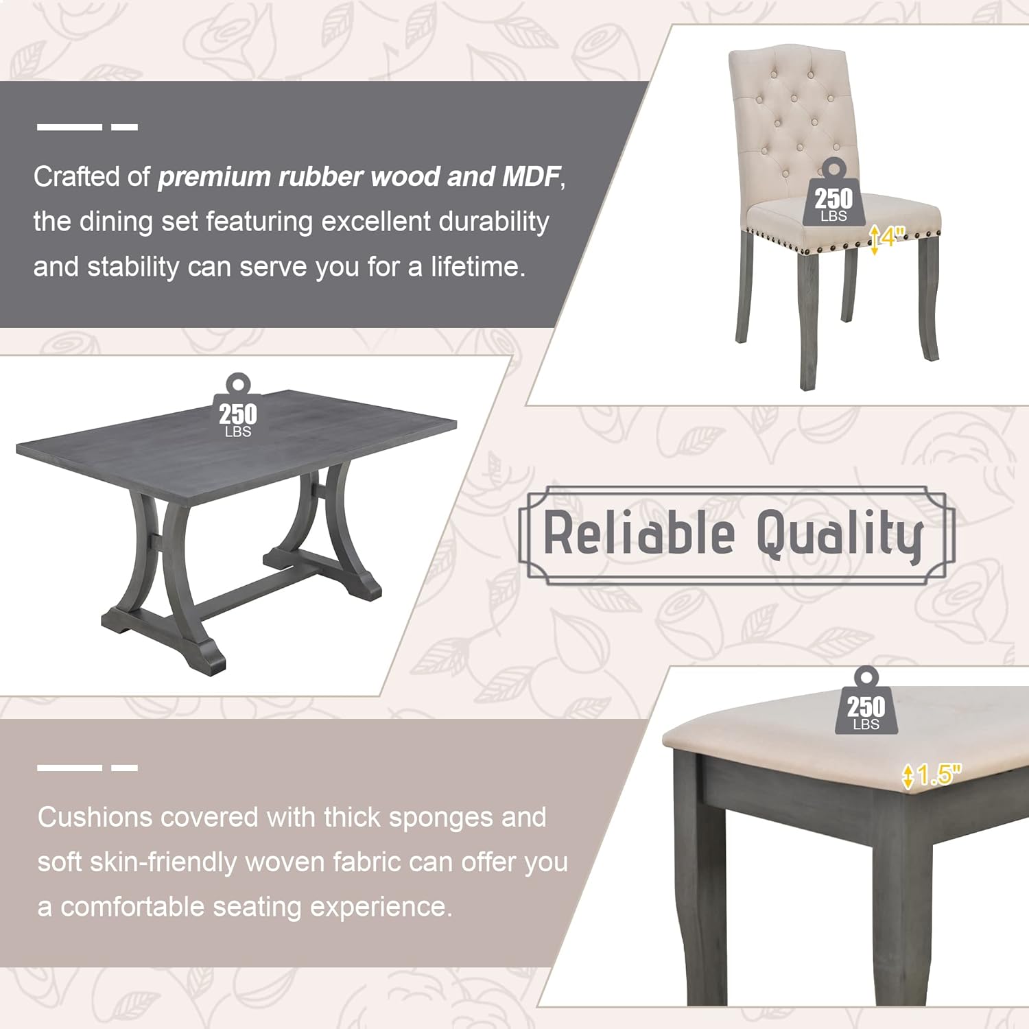 - 【Exquisite Details】- The curved trestle-shaped table legs demonstrate a unique aesthetic feeling, showing the soft and elegant effect of American style. The backrests of the chairs are ornamented with tufted buttons that form an elegant argyle pattern. With nailhead decoration around the side of the upholstered chair cushions, this rustic dining table set makes an impact on the modern and contemporary style.
