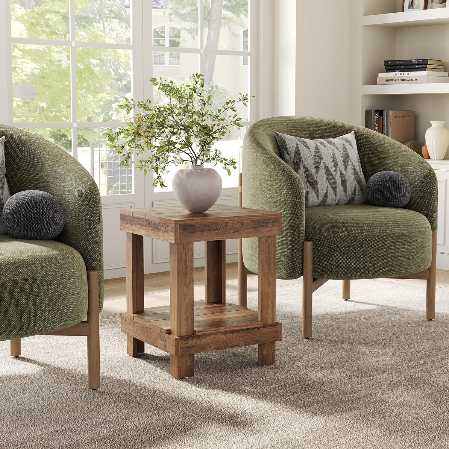 LITTLE TREE 2-Tier End Table, All Wooden Square Side Table with 2 Storage Shelves, Farmhouse Chairside Table Side End Table for Living Room, Small Bedside Table Nightstand for Bedroom, Natural Color