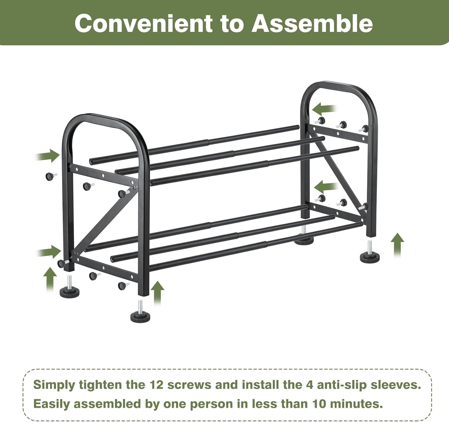 - Adjustable Shoe Rack with 5-Minute Assembly No tools required! Set up this sturdy shoe rack in under 5 minutes. Its simple design and numbered parts ensure hassle-free installation, perfect for busy households