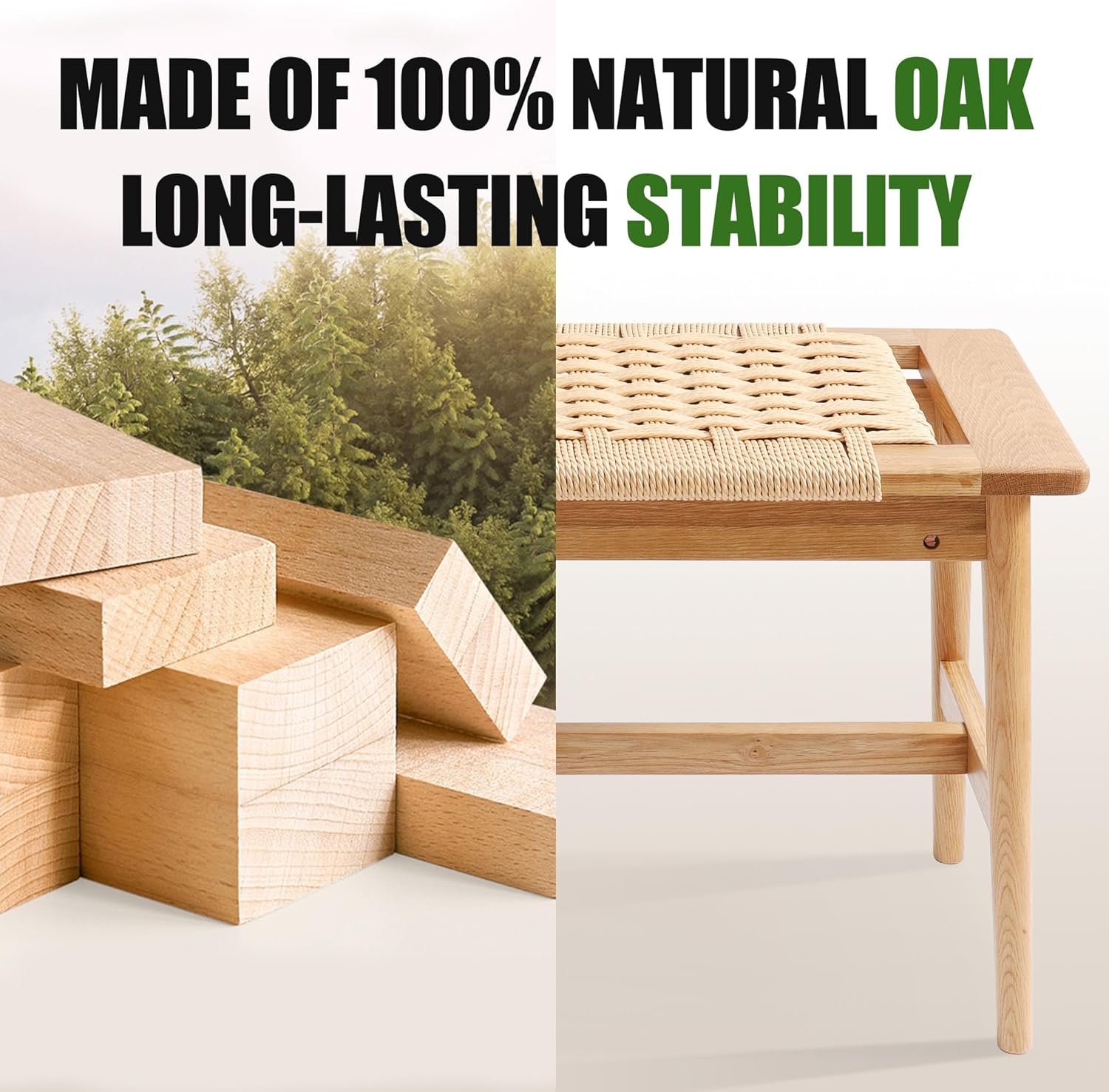 33.5" L Wood Dining Bench Indoor, 100% Natural Solid Oak Bed Bench Hand Woven Enterway Bench Small Bench for Dining Room, Bedroom, Kitchen (Natural)