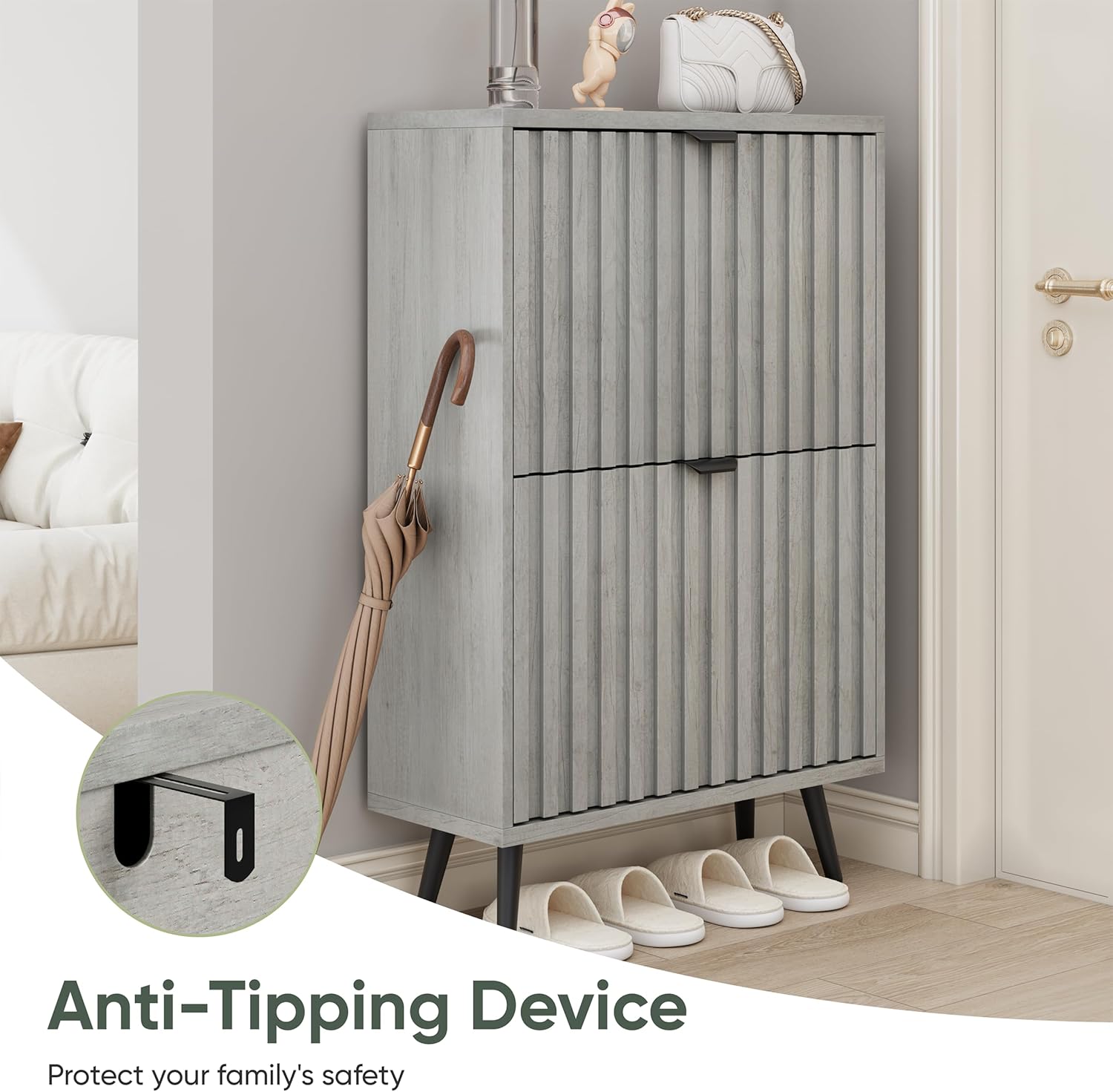 - 【Anti-Tipping Device】With safety in mind, our shoe cabinet is equipped with an anti-tip device that attaches to the wall to prevent tipping and keep children safe. Made of high quality MDF wood and metal legs, it is structurally stable and ensures superb load-bearing capacity.