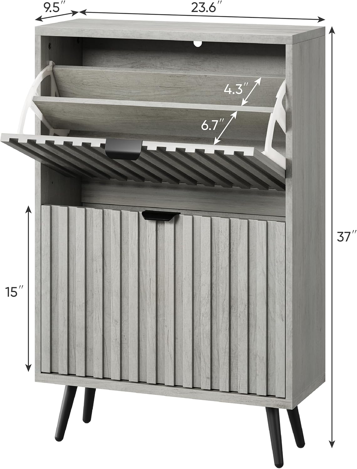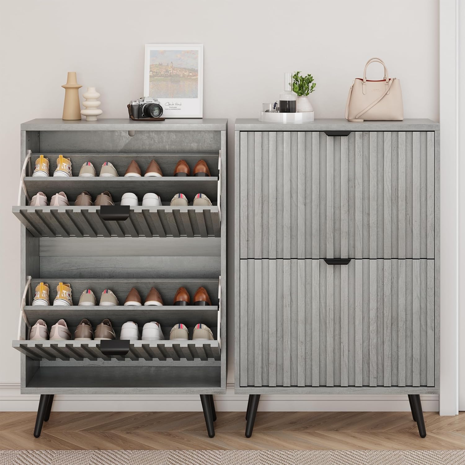 - 【Unique Design】This shoe cabinet features fluted design elements and a special production process that gives the doors with fluted elements an overall seamless look. The combination of grey color and matte metal makes a perfect blend of mid-century and modern. It can be applied to any style.