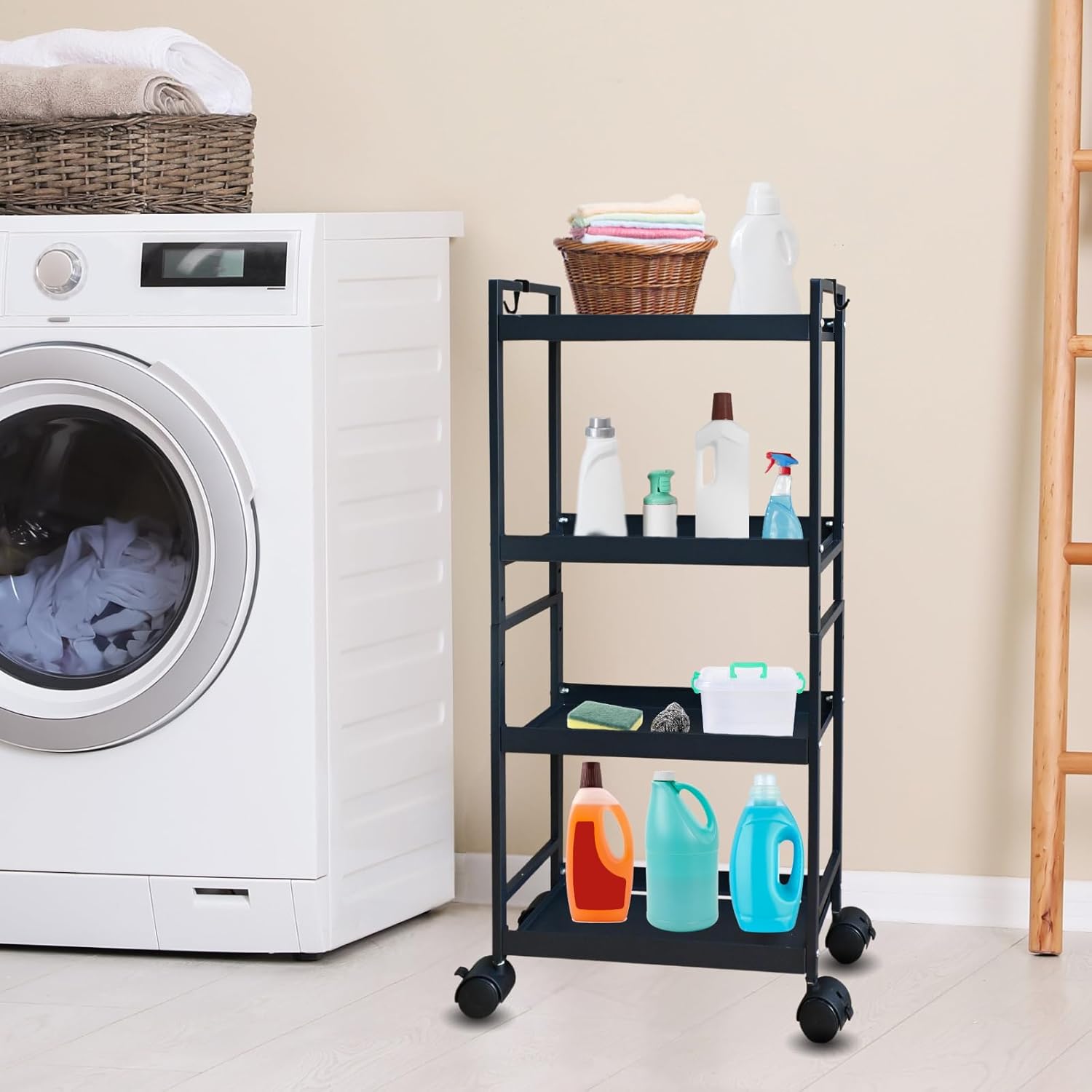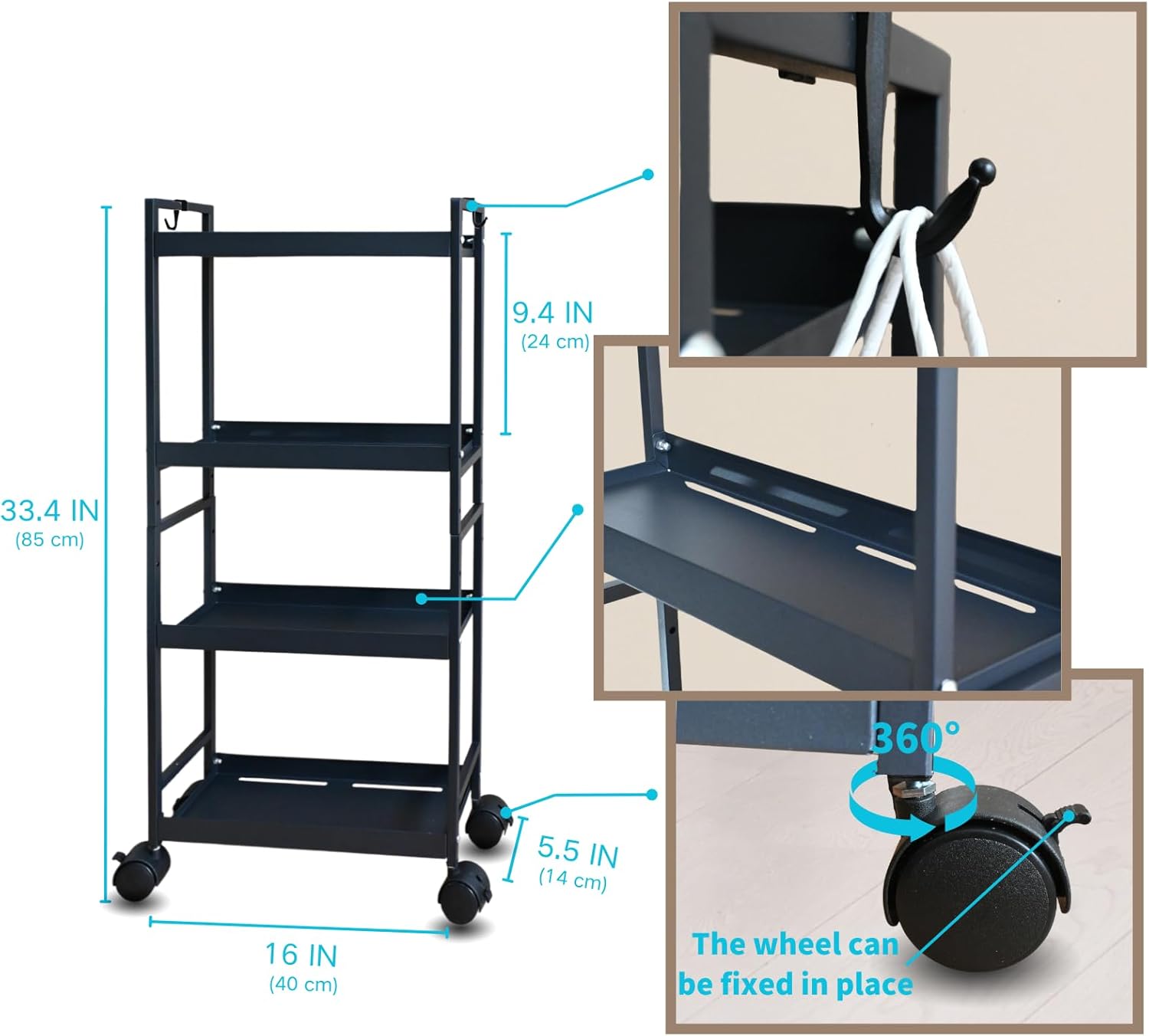 - Save Space : Our Sleek Black Rolling Multi-Purpose Storage Shelf – This versatile storage shelf, with its narrow footprint and crisp black hue, is tailored to fit snugly into the narrow spots around your home