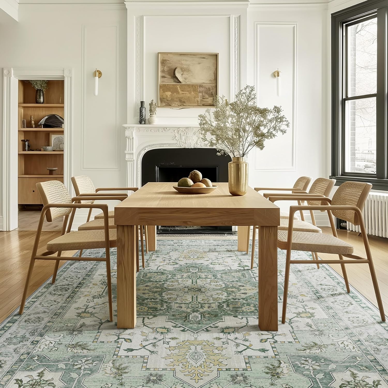GENIMO 10x12 Area Rugs for Living Room, Machine Washable Non Slip Vintage Rugs, Low Pile Lightweight Chenille Print Rug for Bedroom, Dining Room, Home Office, Green