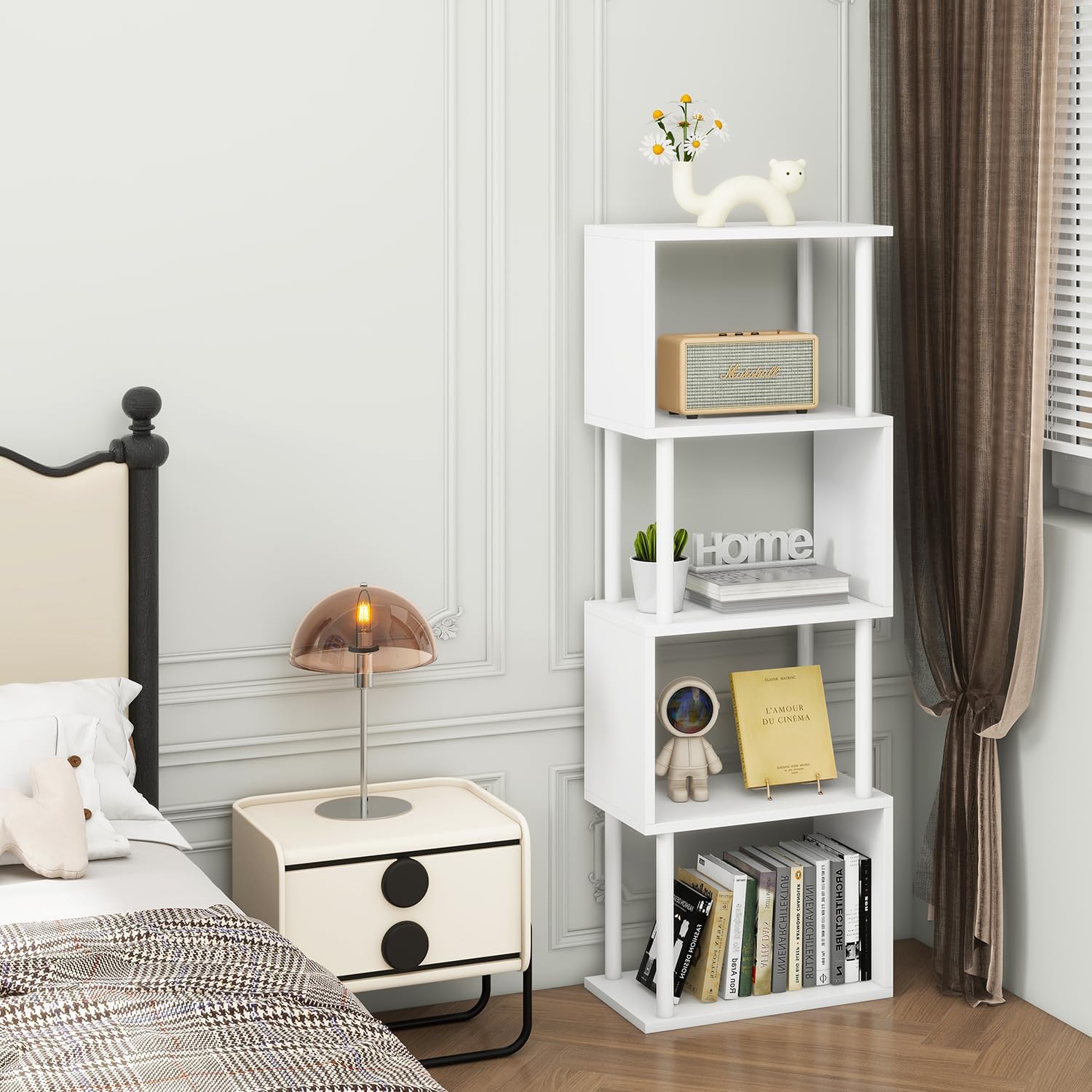 - UNIQUE S-SHAPED DESIGN: The S-shaped geometric design makes this tall bookshelf a work of art. 5 tiers of storage space for all your daily storage needs. The display shelf can also be used as a room divider when placed vertically, or as an ideal wine rack or TV stand when placed horizontally.