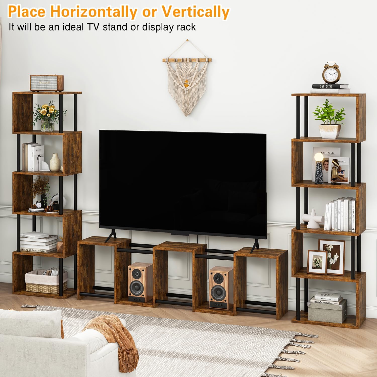 - UNIQUE S-SHAPED DESIGN: The S-shaped geometric design makes this tall bookshelf a work of art. 6 tiers of storage space for all your daily storage needs. The display shelf can also be used as a room divider when placed vertically, or as an ideal wine rack or TV stand when placed horizontally.