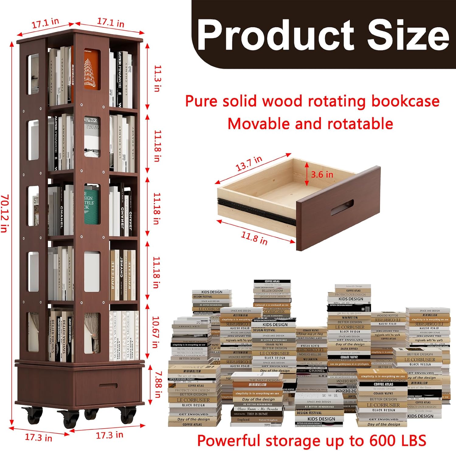 Solid Wood Rotating Bookshelf Tower, 5-Tier Square Spinning Bookcase with Drawer, 70" Floor Standing Revolving Bookshelf on Wheels, Corner Bookcase for Small Space, Walnut