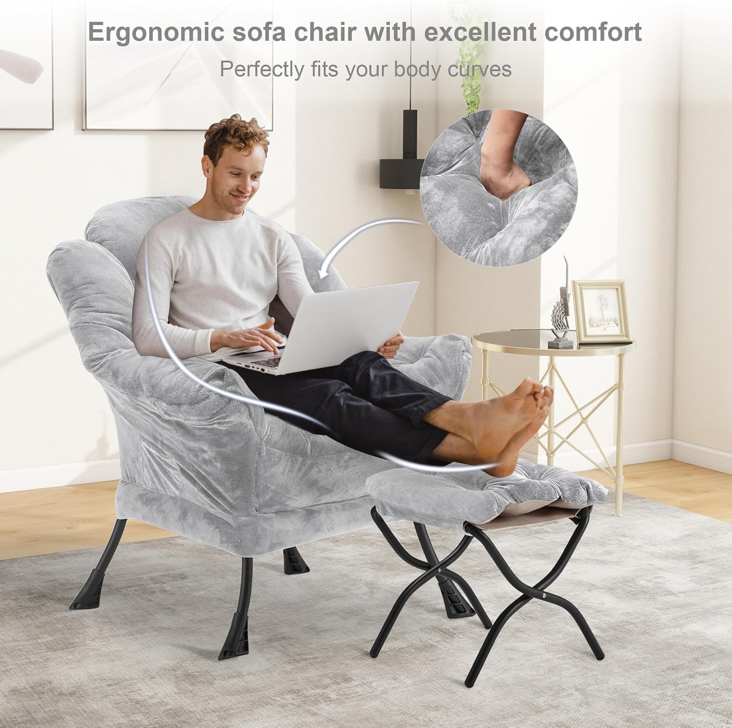 Fabric Lazy Chair with Ottoman, Oversized Upholstered Sofa Chair for Adults, Plush Comfy Lounge Chair with Large Side Storage Pocket, Reading Chair for Living Room, Bedroom, Dorm, Light Gray