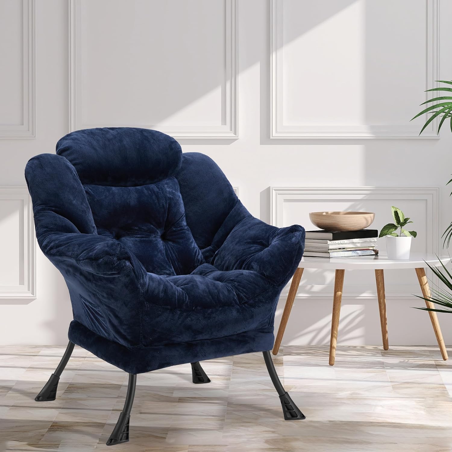 Fabric Lazy Chair for Adults, Oversized Upholstered Sofa Chair, Plush Comfy Lounge Chair with Large Side Storage Pocket, Thick Padded Reading Chair for Living Room, Bedroom, Office, Navy Blue