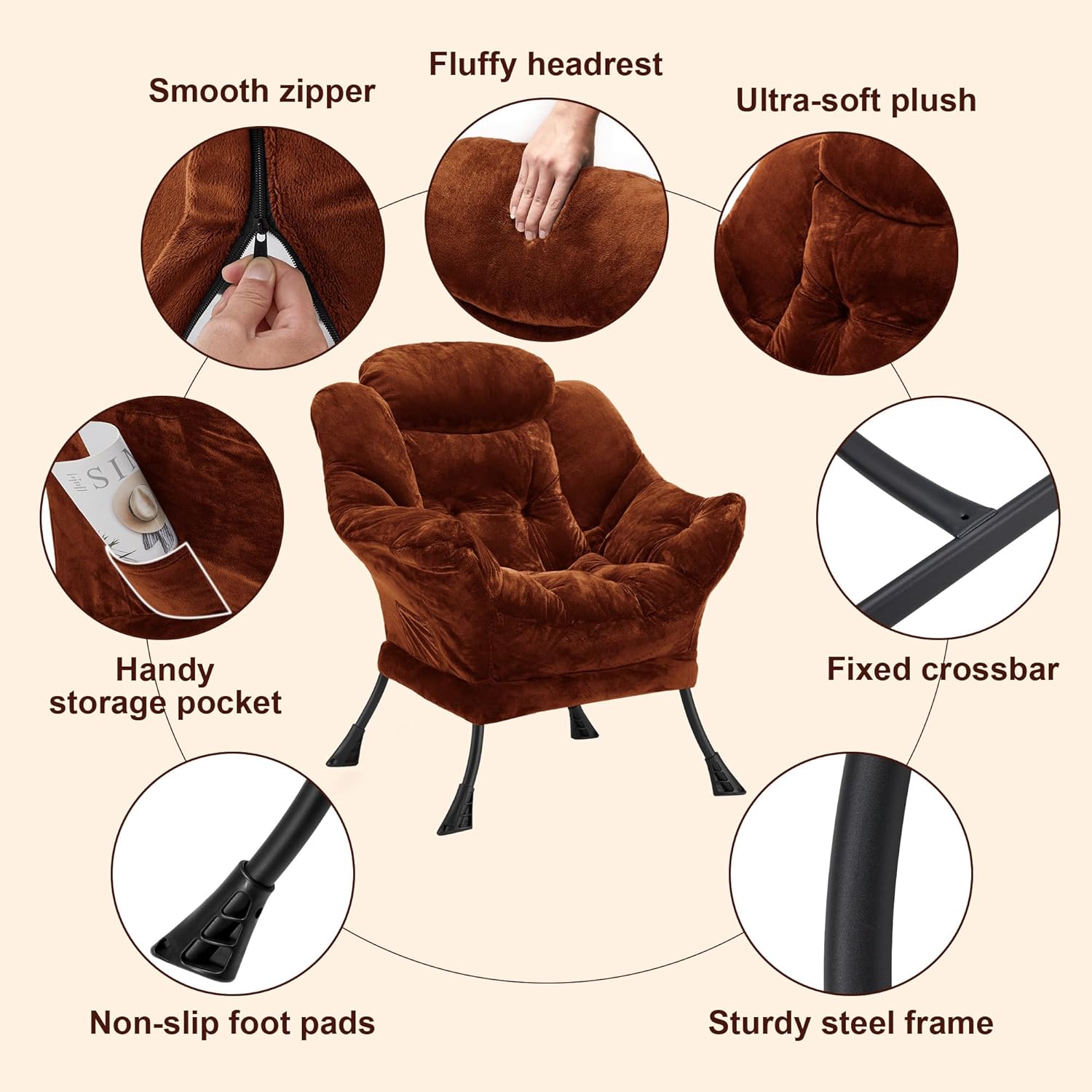 Fabric Lazy Chair for Adults, Oversized Upholstered Sofa Chair, Plush Comfy Lounge Chair with Large Side Storage Pocket, Thick Padded Reading Chair for Living Room, Bedroom, Study Room, Brown