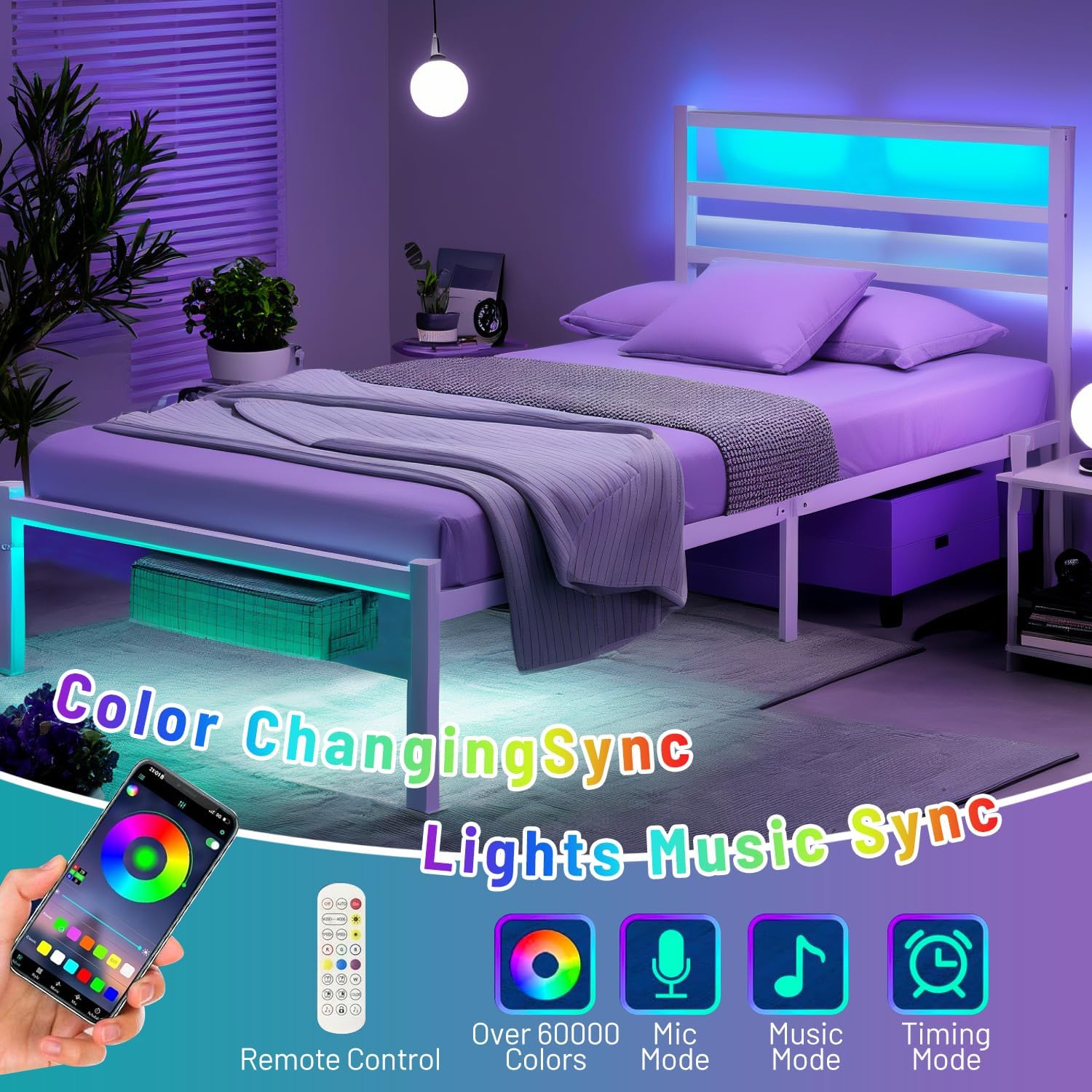 Twin Bed Frame with Headboard,Heavy Duty Steel Slats Support-LED Bed Frame with USB Charging Station,Mattress Foundation-Under Bed Storage,No Box Spring Needed,Noise Free,White