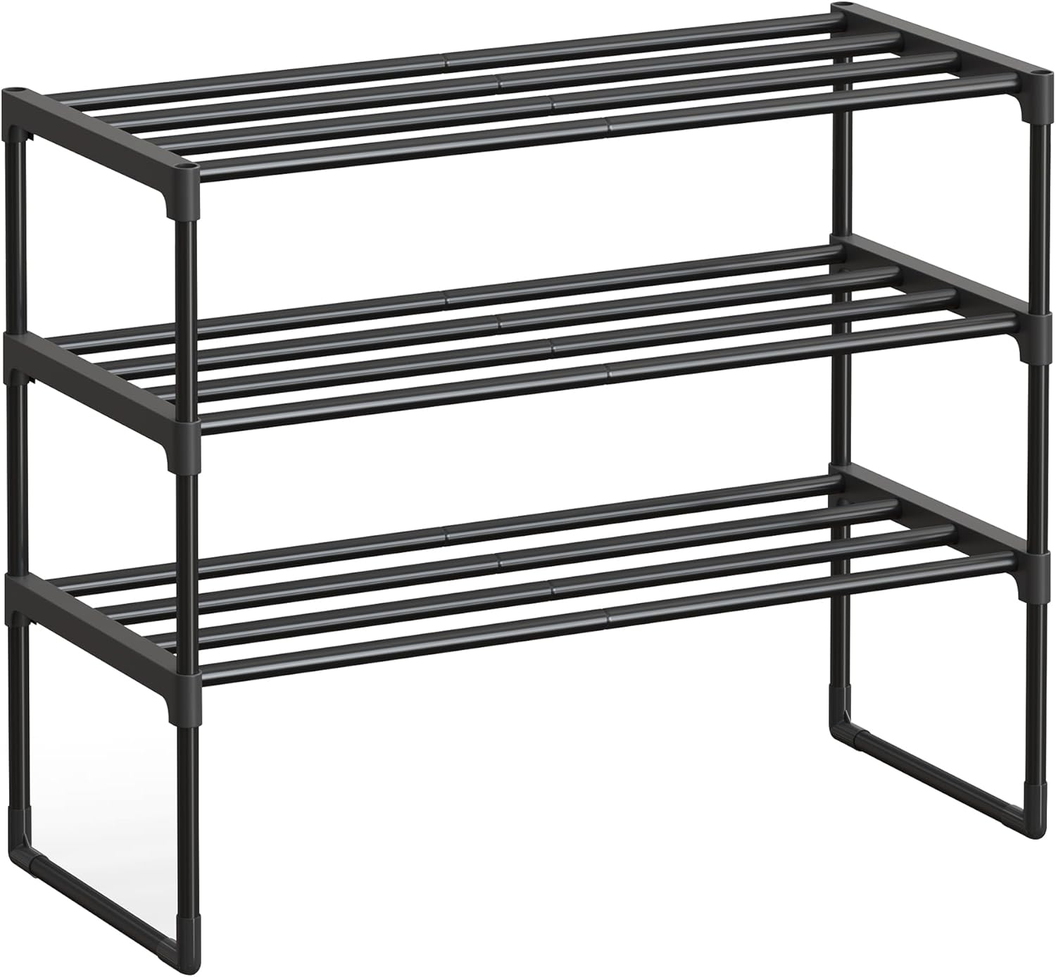 SONGMICS Shoe Rack, 3-Tier Shoe Organizer, Metal Storage Shelf, Upright or Upside Down, for 8-12 Pairs, Stackable, for Entryway, 11.8 x 26.8 x 21.7 Inches, Black ULSA203B01
