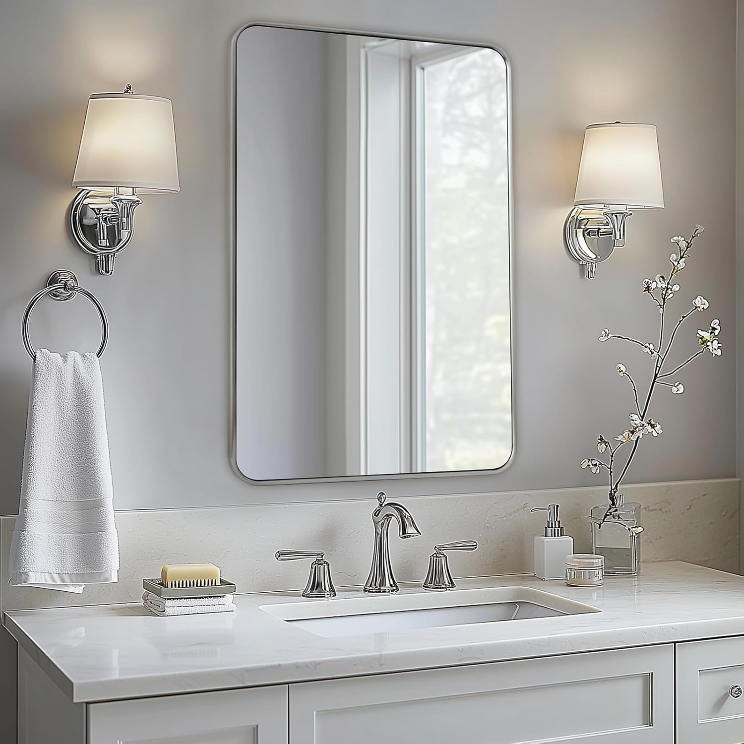 ANDY STAR Brushed Nickel Mirror, Stainless Steel Metal Frame 24x36 Inch Bathroom Mirror for Over Sink, Modern Rounded Corner Slim Silver Vanity Mirror for Wall Mounted Horizontally or Vertically
