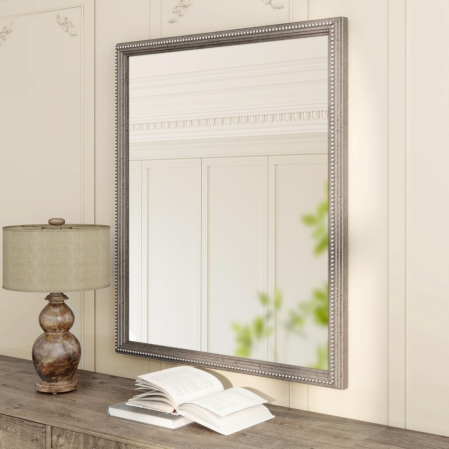 Axeman 30x36 Wood Wall Mirror, Rustic Bathroom Mirror, Vintage Wall Mounted Mirror Tempered Glass with Beaded Wooden Frame for Farmhouse Living Room Vanity Bedroom Entryway, Grey