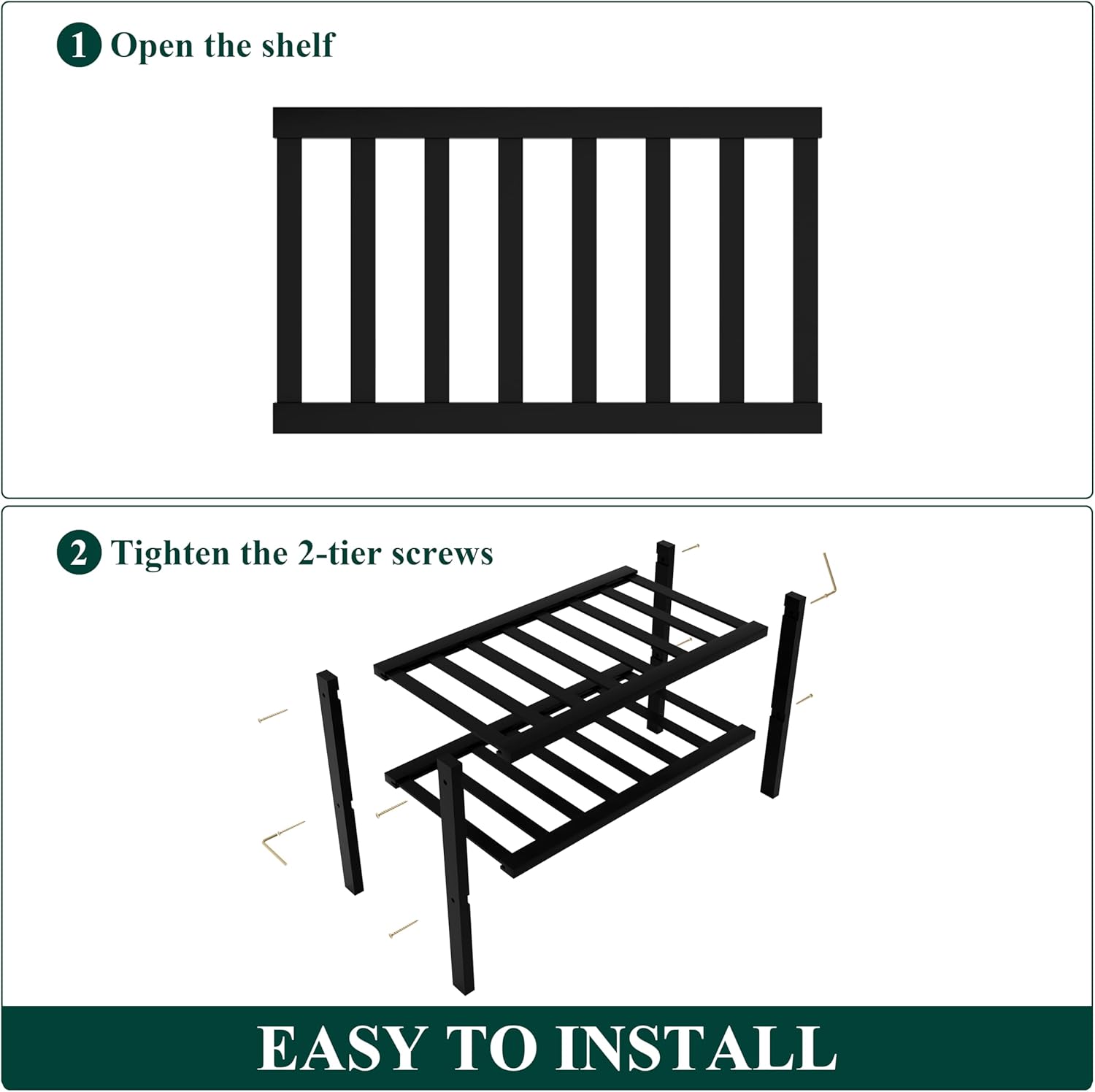 - [Stackable & Expandable] The racks can be used separately or stacked together for more storage. Combine 1-tier + 2-tier for 3 tiers, or 2-tier + 2-tier for 4 tiers. Easily expand and customize the configuration to fit your space and needs