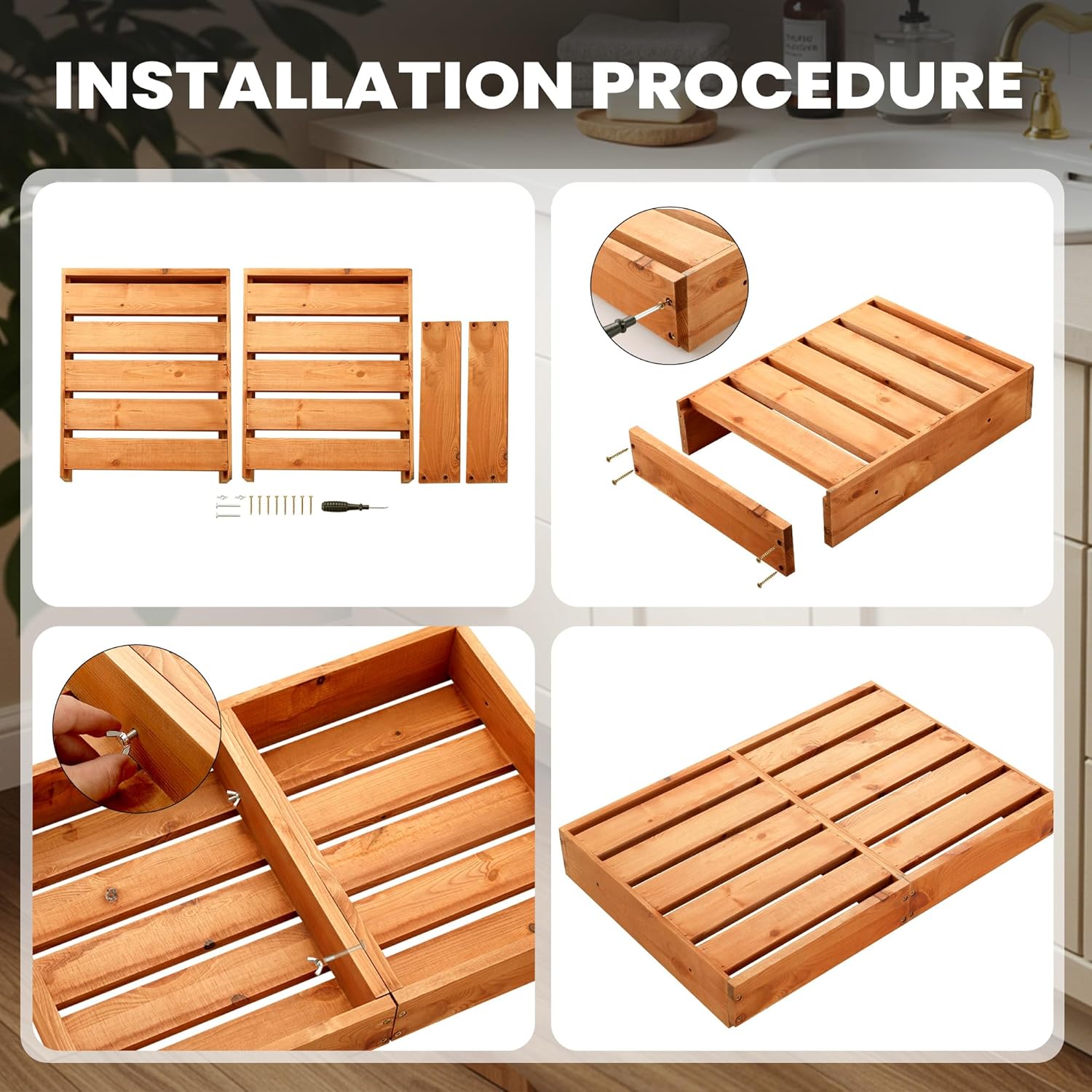 - Helpful Reminder: The front wooden board, with 4 screw holes, can be installed in two alignment options, both equally suitable.