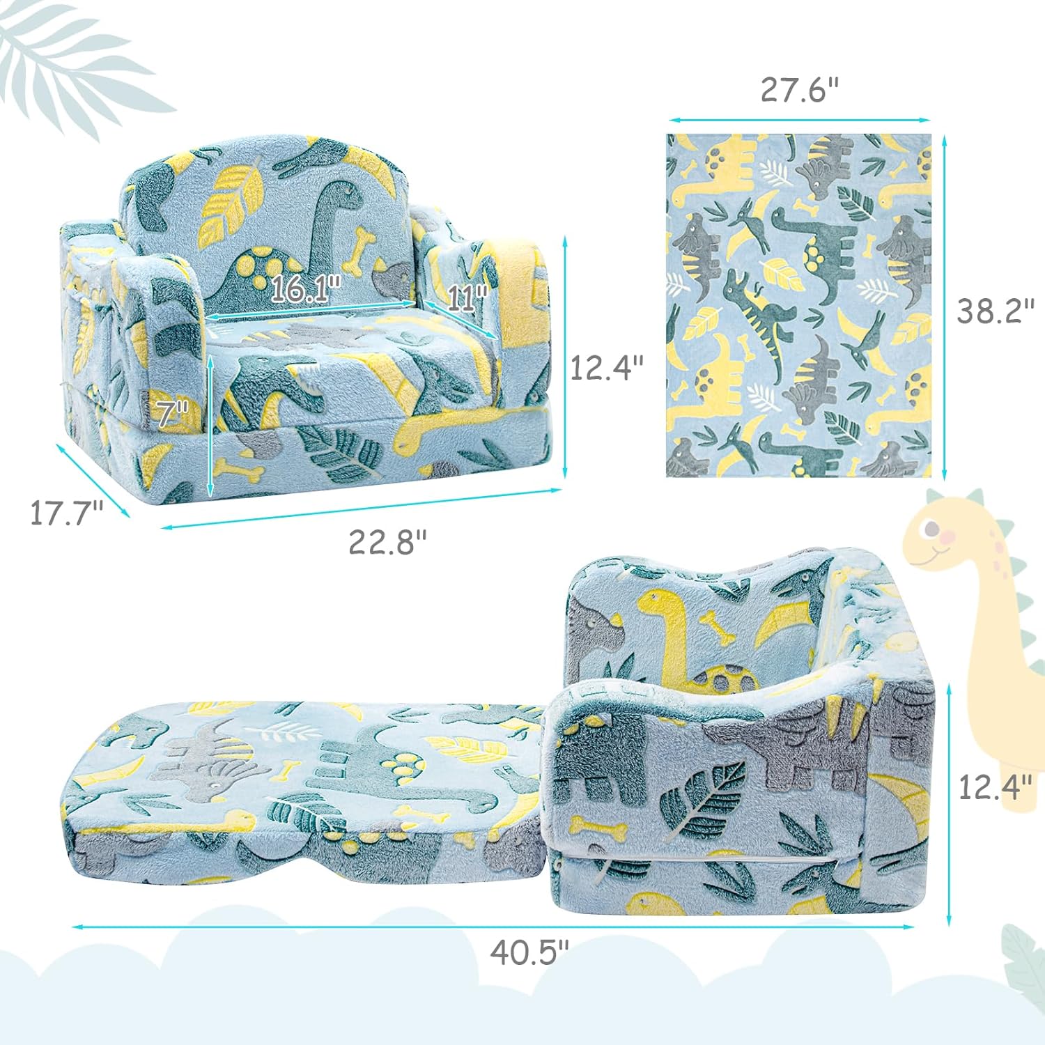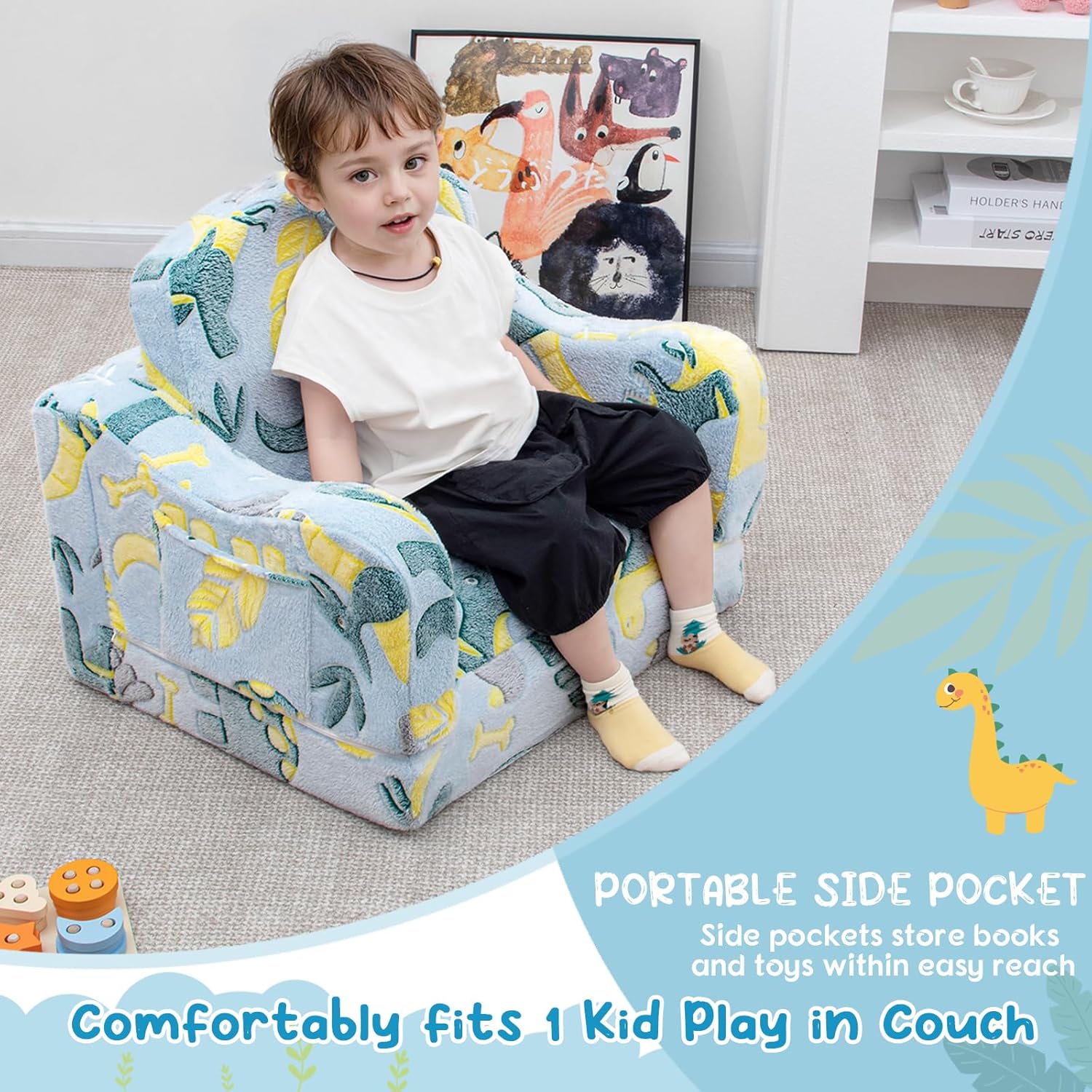 Comfy Toddler Chair and Couch for Kids with Blanket,2-in-1 Soft Plush Fold Out Toddler Couch for Girls and Boys,Convertible Sofa to Lounger for Playroom,Glowing Dinosaur