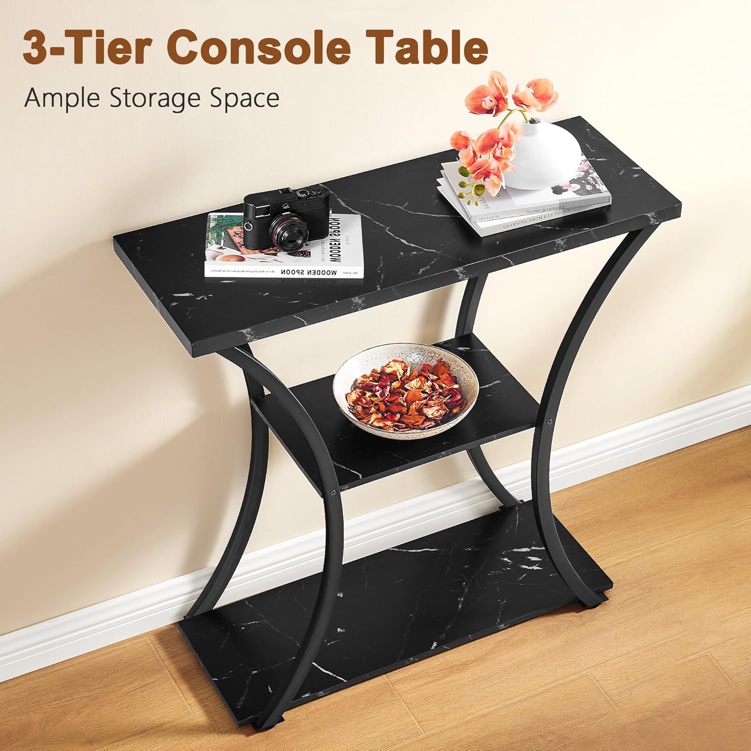 Hoctieon 3 Tier Console Table with Open Wood Shelves, Decorative Entryway Table with Curved Metal Frames, Narrow Sofa Table for Entrance, Living Room, Hallway, Black Marbled