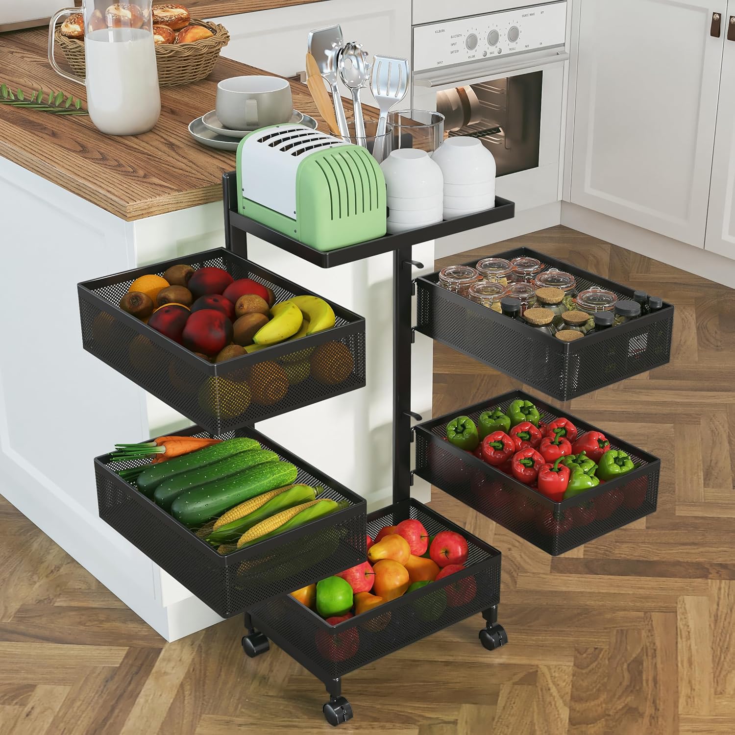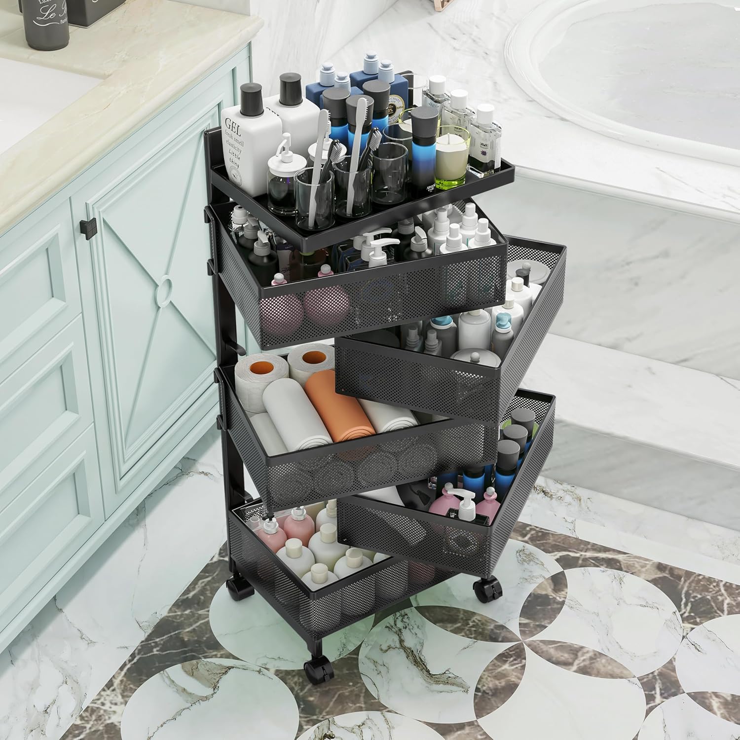 Rolling Rotating Storage Cart No Assembly Required,Bathroom Shelf Fruit and Vegetable Basket for Kitchen,Storage Drawer Organizer Cart ,Metal Utility cart on Wheels(Black, 5 Tier-Square)