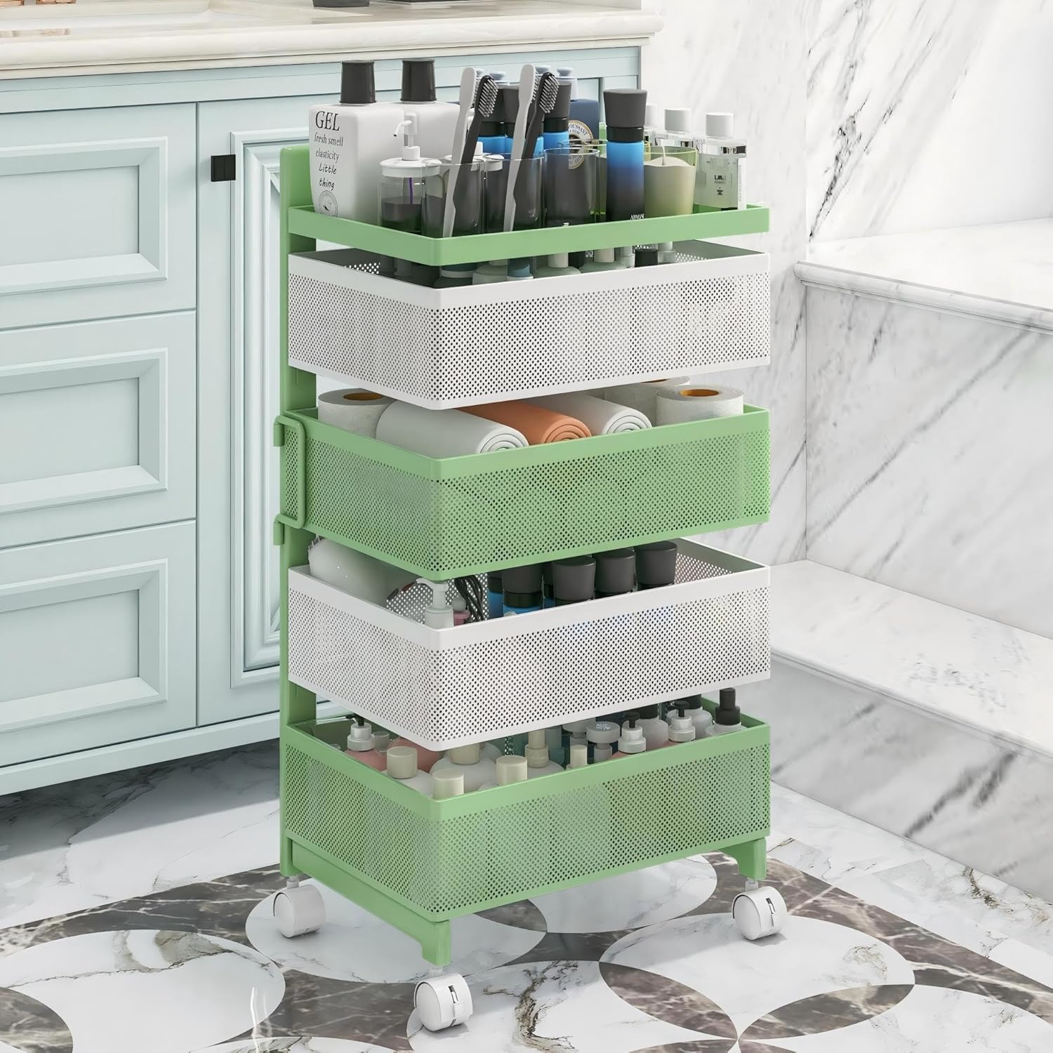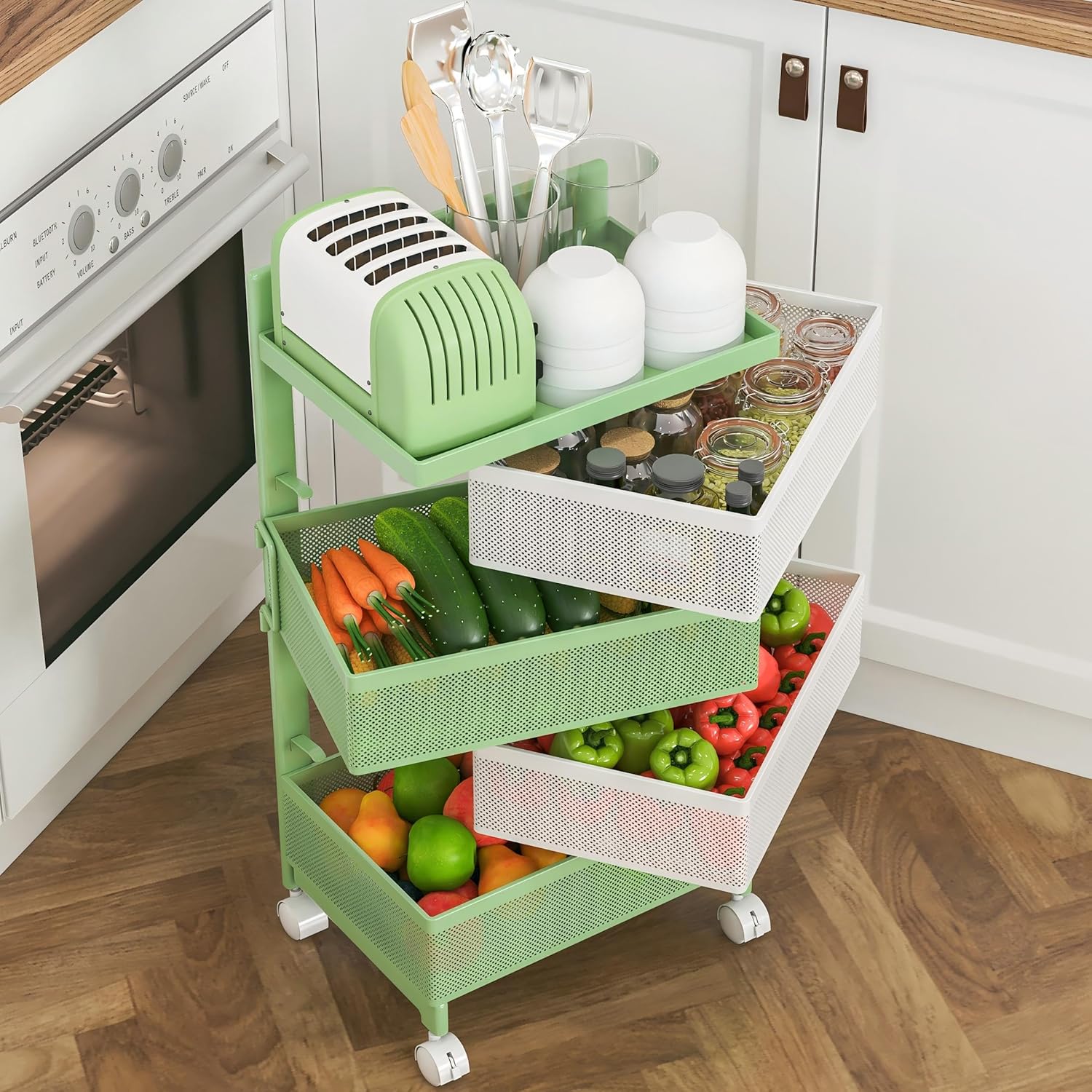 Fruit Basket for Kitchen No Assembly 4-Tier Rotating Storage Rack, Vegetable Storage Cart,Bathroom Shelf,Storage Drawer Cart,Kitchen Organizers and Storage Cart(Green White, 4 Tier-Square)
