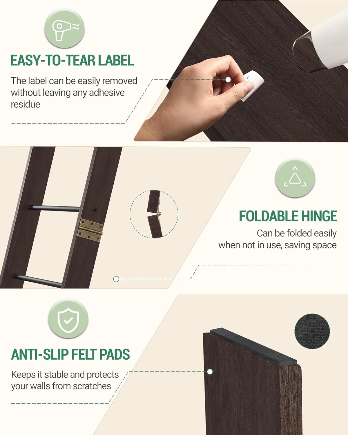 - Wall and Floor Friendly: The ladder rack comes with felt pads on the beveled top and the bottom of the legs to prevent scratching your walls and floors. Made of high quality wood so you don't have to worry about cracking or splintering, it is very smooth to use.