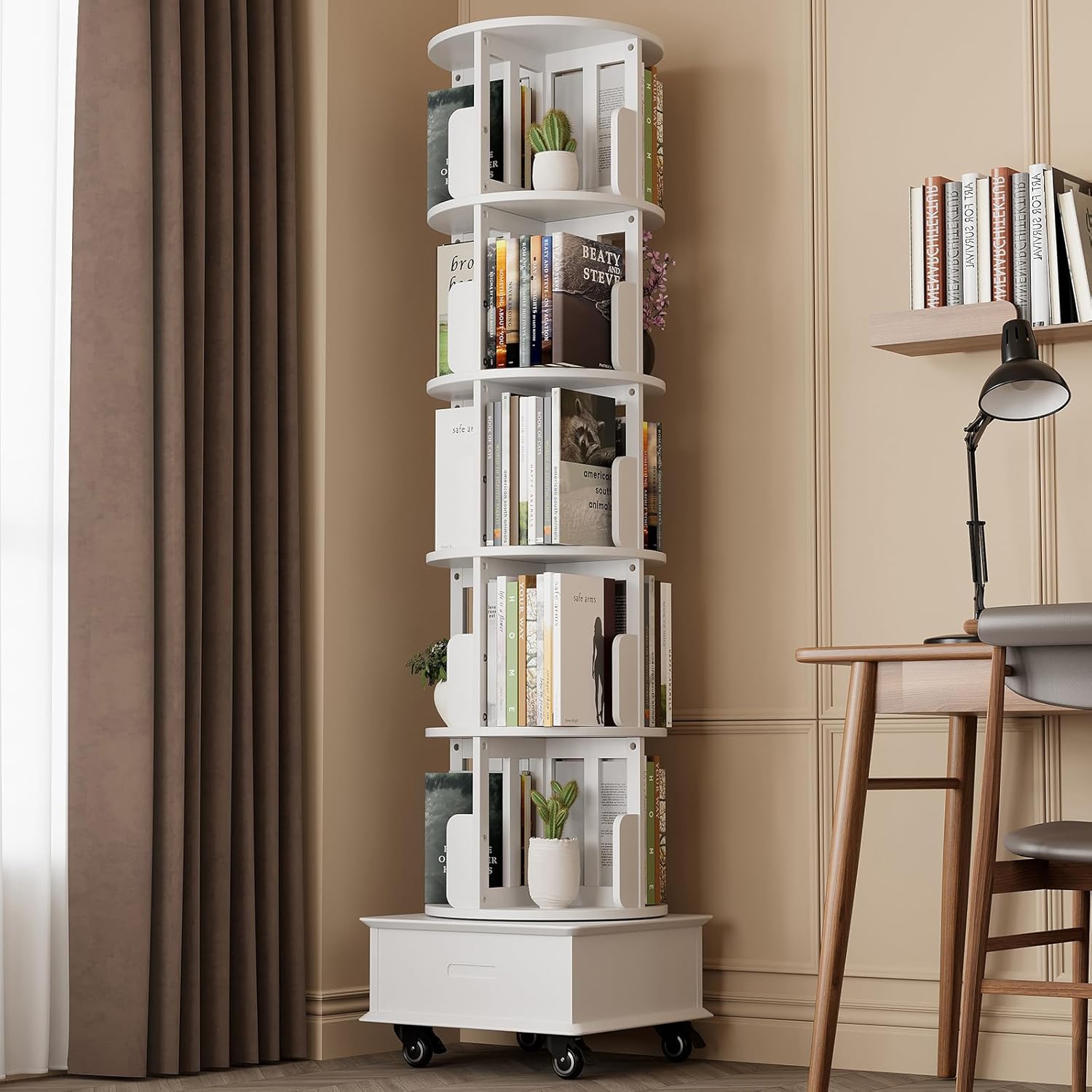Solid Wood Rotating Bookshelf Tower, 5 Tier Spinning Bookcase with Drawer, 72" Floor Standing Revolving Bookshelf on Wheels, Corner Bookcase for Small Space, White