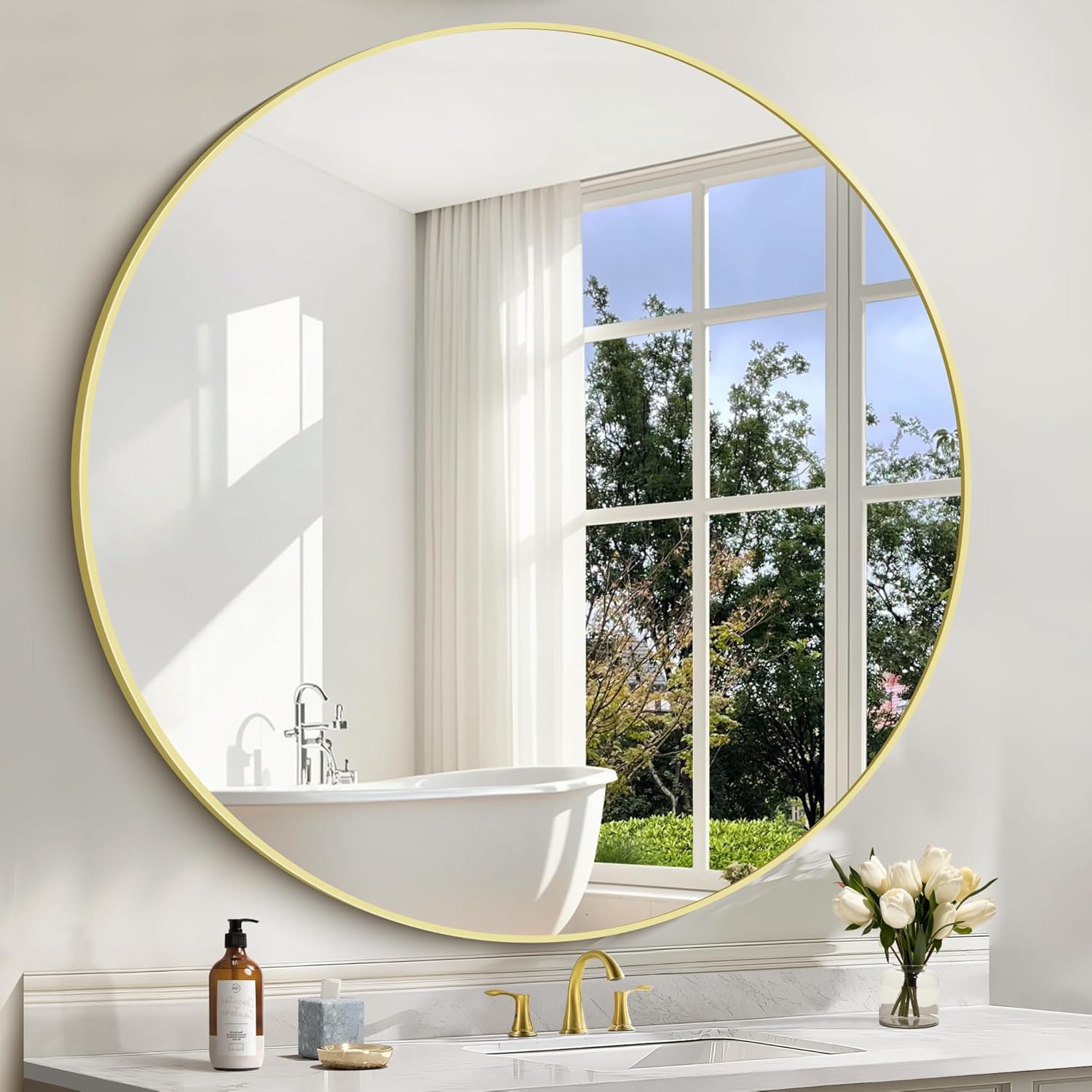 - EASY TO INSTALL: Our gold round mirror features an smooth round design that adds a soft aesthetic to the space. Our round wall mirror comes with wall mounting hardware for hanging. Easy to install by following the installation instructions.