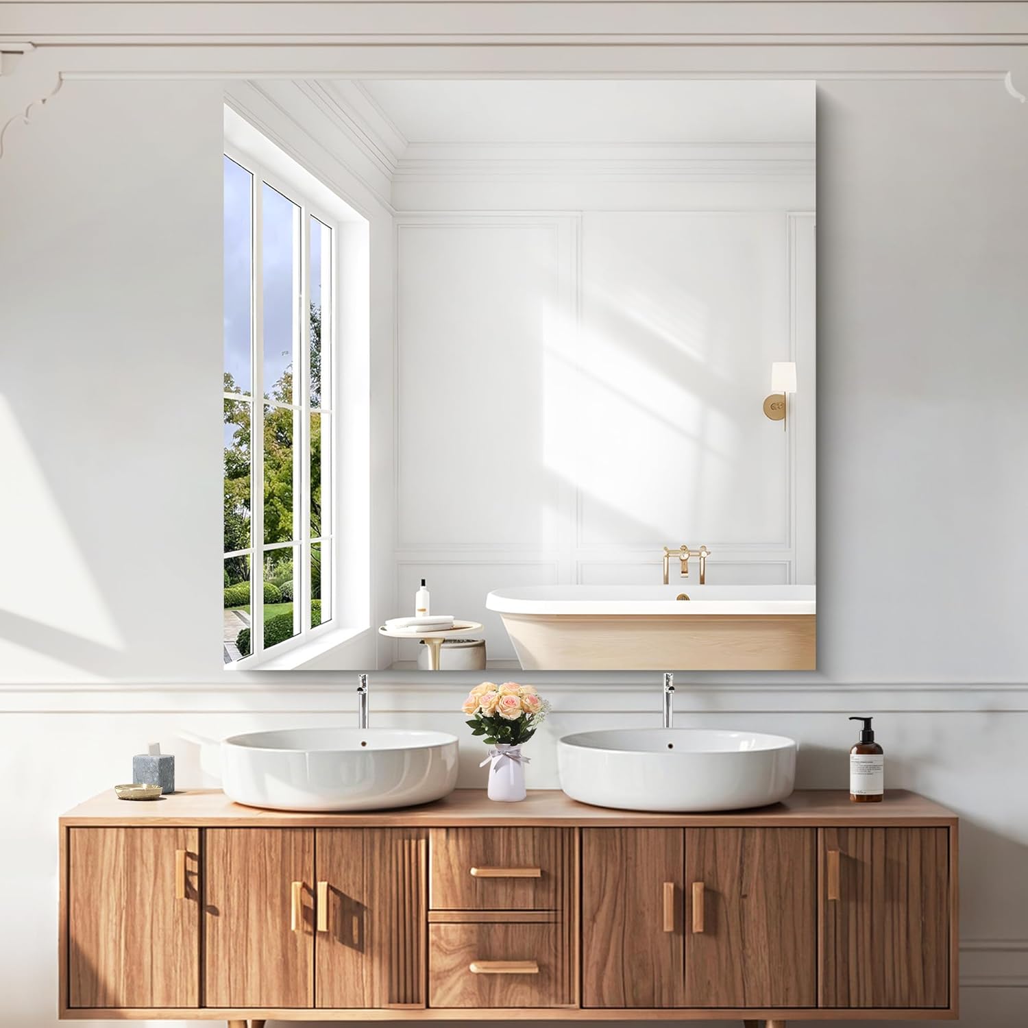 - HD 1:1 Reflection:KOCUUY frameless wall mirror offers a high-definition reflection. The premium mirror backing ensures a 1:1 real reflection with no distortion, giving you an clear and bright visual experience. This unframed mirrors are not only rust-resistant but also promise durability, making them ideal for high-humidity bathroom conditions