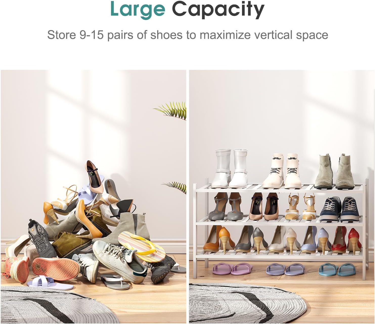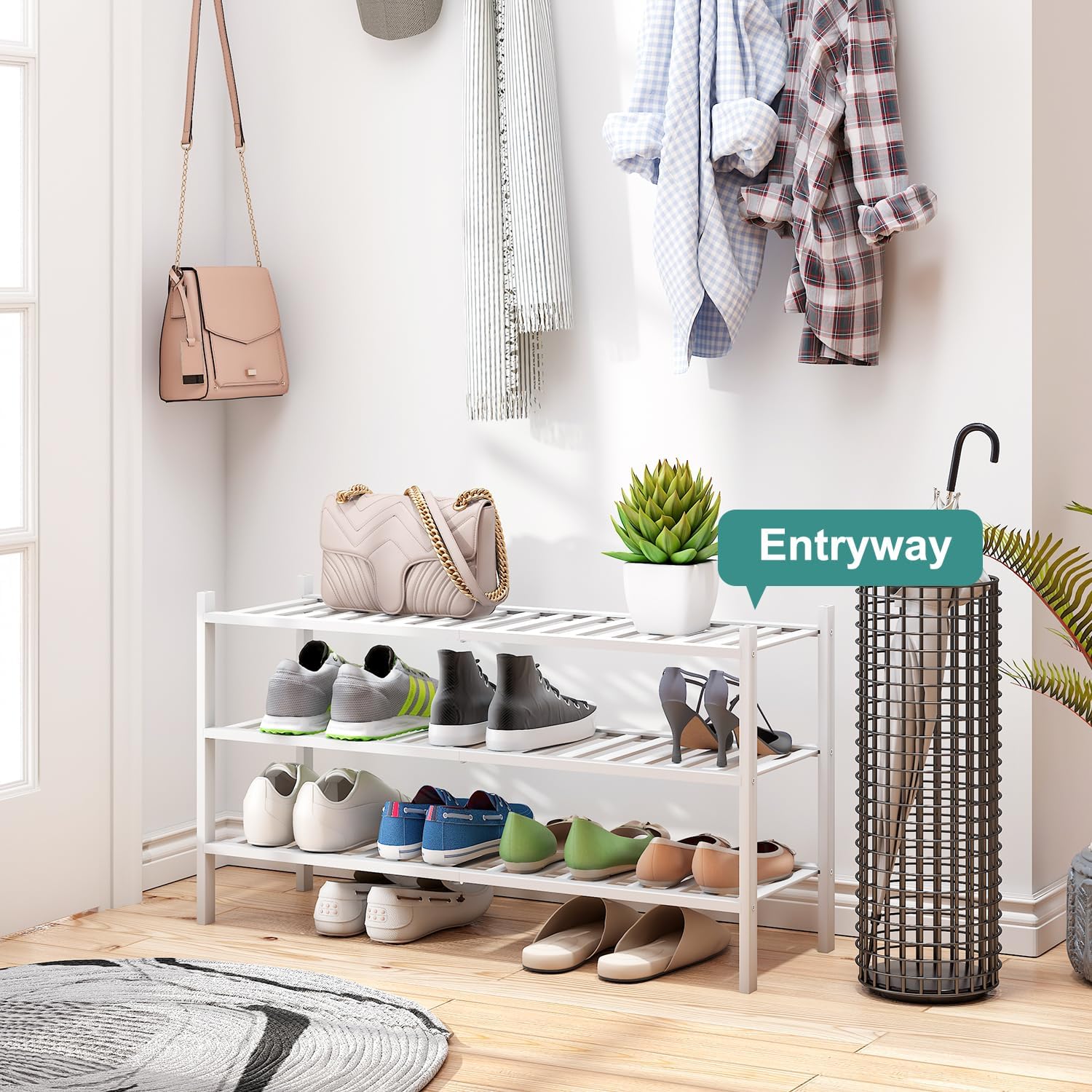3-Tier Long Shoe Rack, Bamboo Wood Shoe Rack for Closet, Entryway & Hallway, Stackable White Shoe Shelf Storage Organizer for Indoor Outdoor