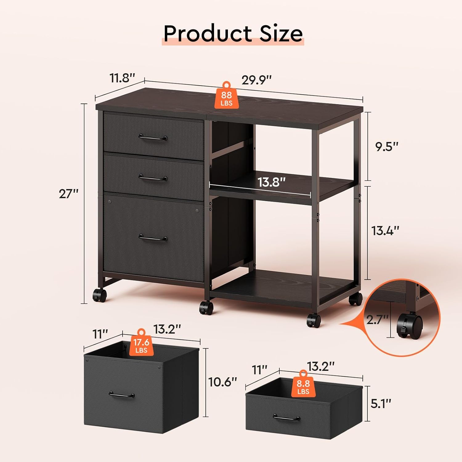 3 Drawer File Cabinet with Wheels Rolling Printer Stand with Open Storage Shelf Fabric Lateral Filing Cabinet for Home Office,Black