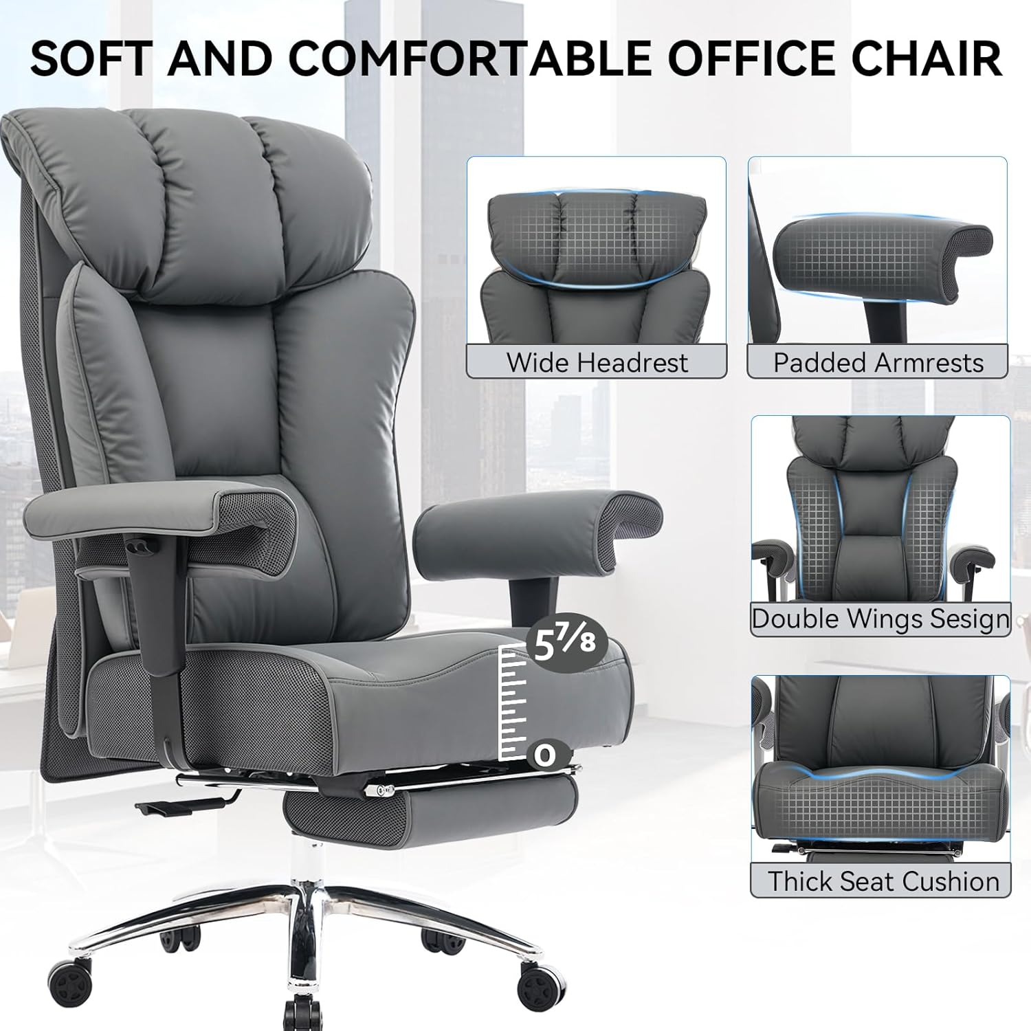 - SAFE AND DURABLE EXECUTIVE OFFICE CHAIR: The home office chair is BIFMA certified and equipped with a level 3 gas cylinder certified by SGS. This computer chair features a high-strength metal base and smooth-rolling casters, ensuring long-lasting durability for the big and tall office chair. The base can support up to 450 pounds, providing safety and reliability.