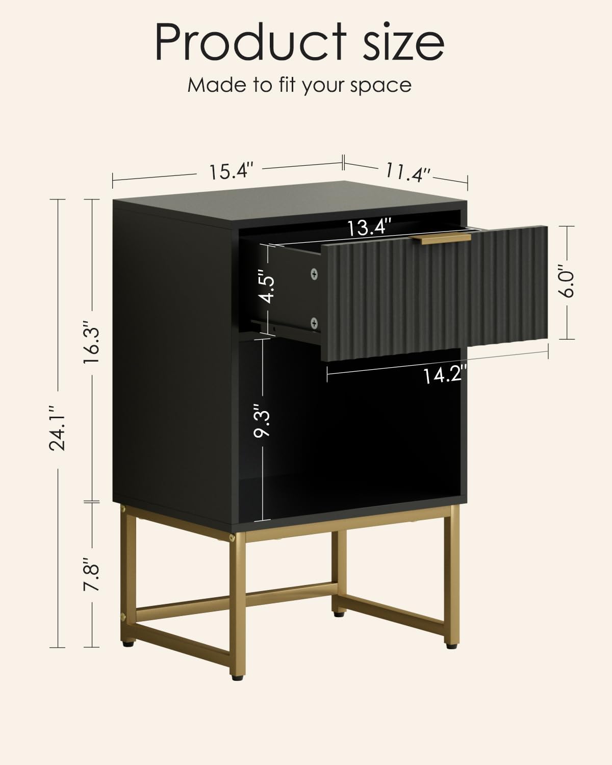 - Multifunctional Night Stand: Measuring 11.42''D×15.35''W×24.21''H (39 x 29 x 61.50 cm), this compact yet spacious bedside table is perfect for placement next to most beds, chairs, and sofas. It features a storage drawer and an open space to store remote controls, glasses, medication, and other essentials, making it an ideal side table or end table for the living room.