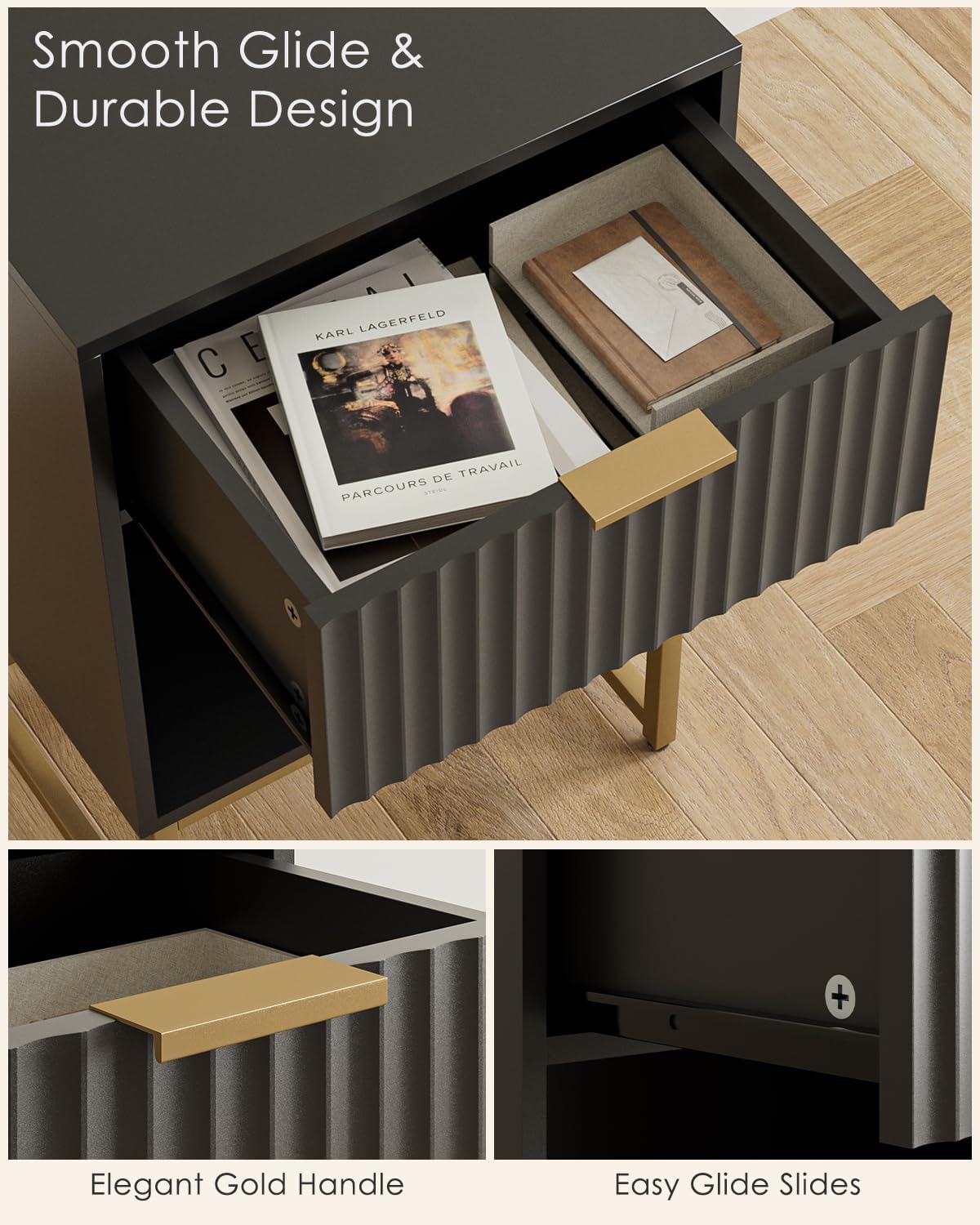 - Unique Modern Design: This nightstand combines farmhouse and bohemian decor styles with a distinctive wave-textured finish. The elegant lines of the drawers, combined with the refined gold and black, add a touch of sophistication and charm to your bedroom furniture.