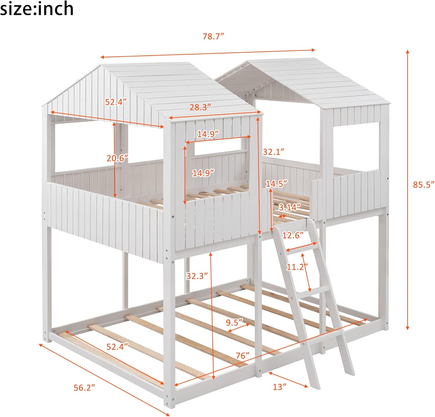 - 【Playhouse-Inspired Bunk Bed】: Featuring a pitched roof, window, and playhouse-inspired design, this full-over-full bunk bed doubles as a sleeping space and semi-enclosed play area for imaginative fun. Its unique style creates a cozy atmosphere for kids.