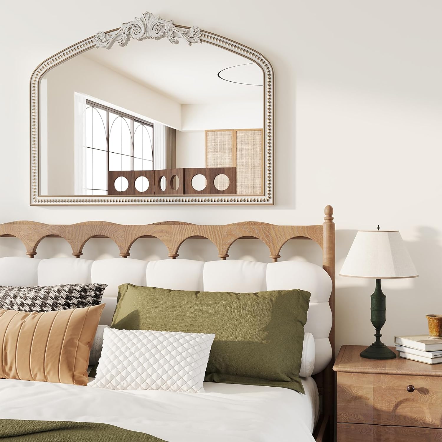 42''x32'' Baroque Wide Arched Wall Mirror, Ornate Wooden Farmhouse Arch Decorative Mirrors for Entryway, Fireplace, Bathroom with Beads Decor