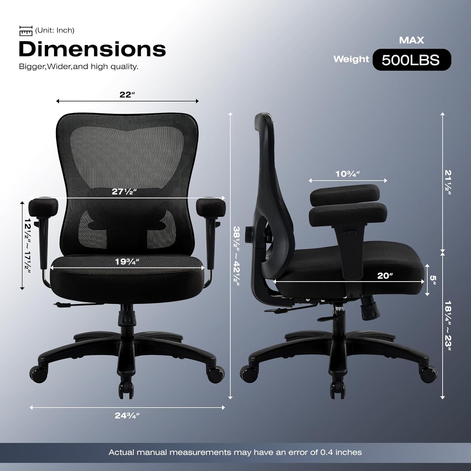 - 【Heavy-Duty 500lbs Capacity】 Engineered for lasting durability, this chair boasts a reinforced five-star metal base with a widened, thickened design and a robust class-4 cylinder, capable of supporting up to 500 pounds. The robust five-star metal base ensures superior stability and long-term reliability, perfect for heavyweight users seeking a sturdy office chair for daily use.