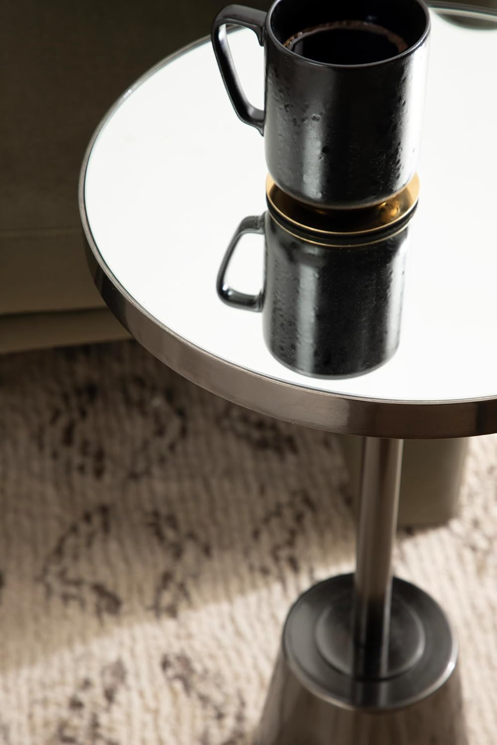 - Quality Materials: Between its sturdy metal base and mirrored glass tabletop, this round end table is constructed to last