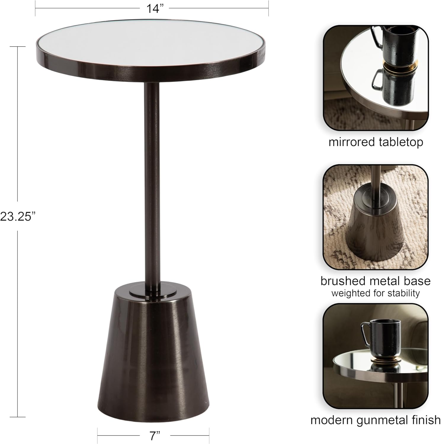 Kate and Laurel Tira Elegant Round Mirrored Side Table, 14 x 14 x 24, Gray Gunmetal, Modern Circle End Table for Use as Bedroom Nightstand or Living Room Plant Stand Table