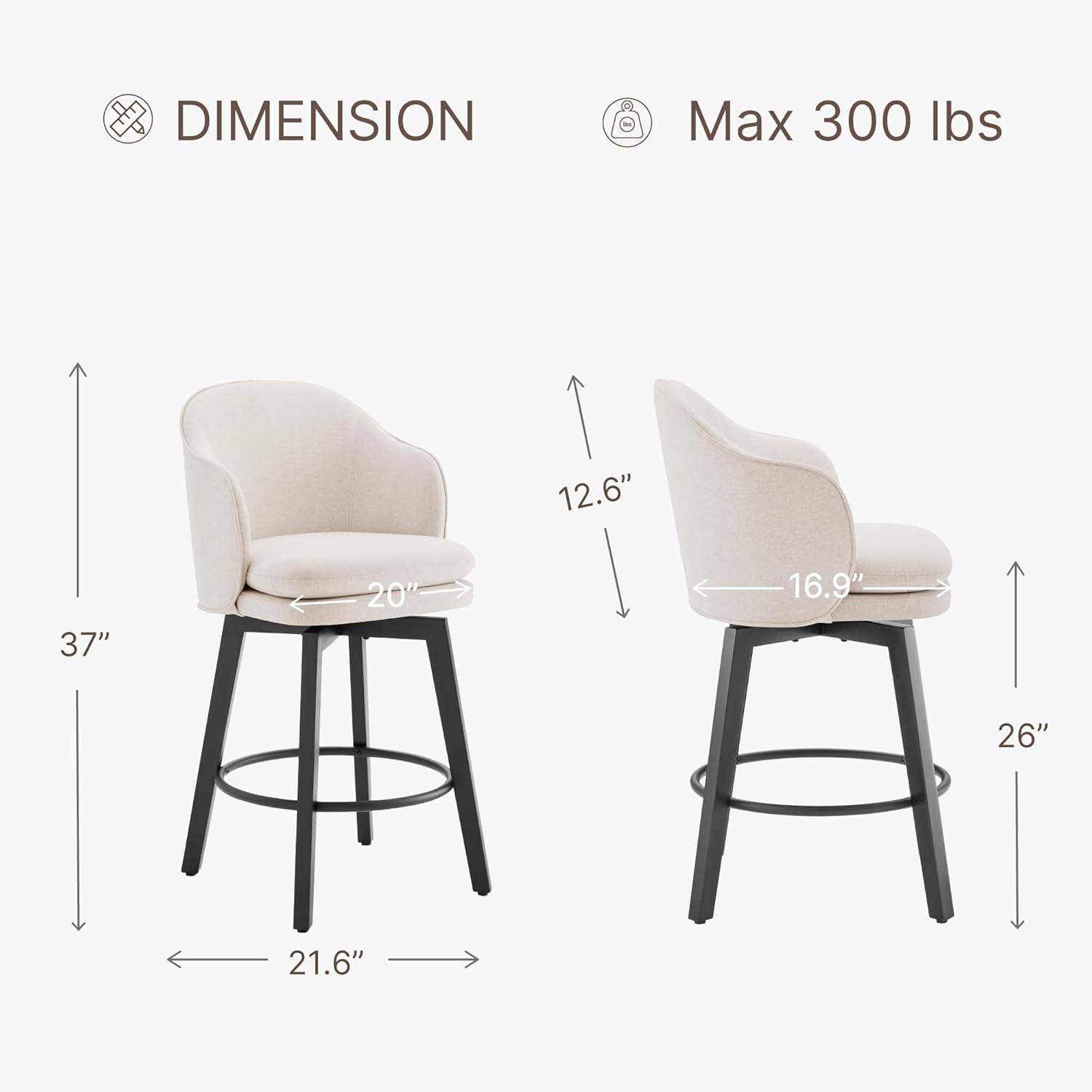 - 【Suitable Multi-scene】Black-colored wood frames and offer a refined element to otherwise rustic materials, giving these swivel bar stools more versatility. Fabric and leather material adds a soft atmosphere, making it more suitable for a variety of kitchen islands, count islands, restaurants, and cafes.