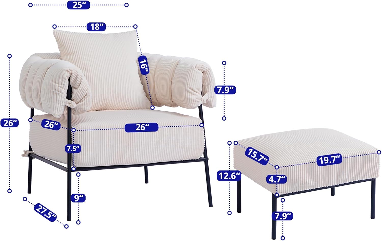 HollyHOME Modern Velvet Accent Chair with Ottoman, Upholstered Comfy Reading Chair and Footstool, Fabric Large Lazy Arm Chair and Stool, Lounge Sofa Chair for Living Room, Bedroom, Beige Chair&Stool