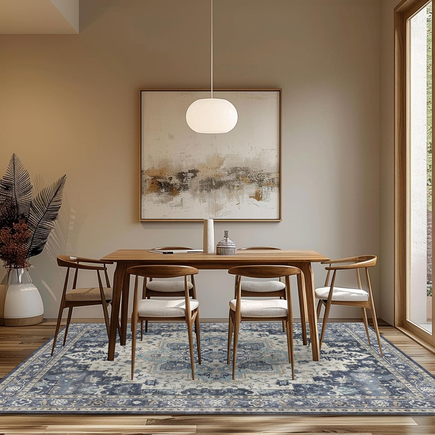 GENIMO 9x12 Area Rugs for Living Room, Machine Washable Non Slip Vintage Rugs, Low Pile Lightweight Chenille Print Rug for Bedroom, Dining Room, Home Office, Center Blue
