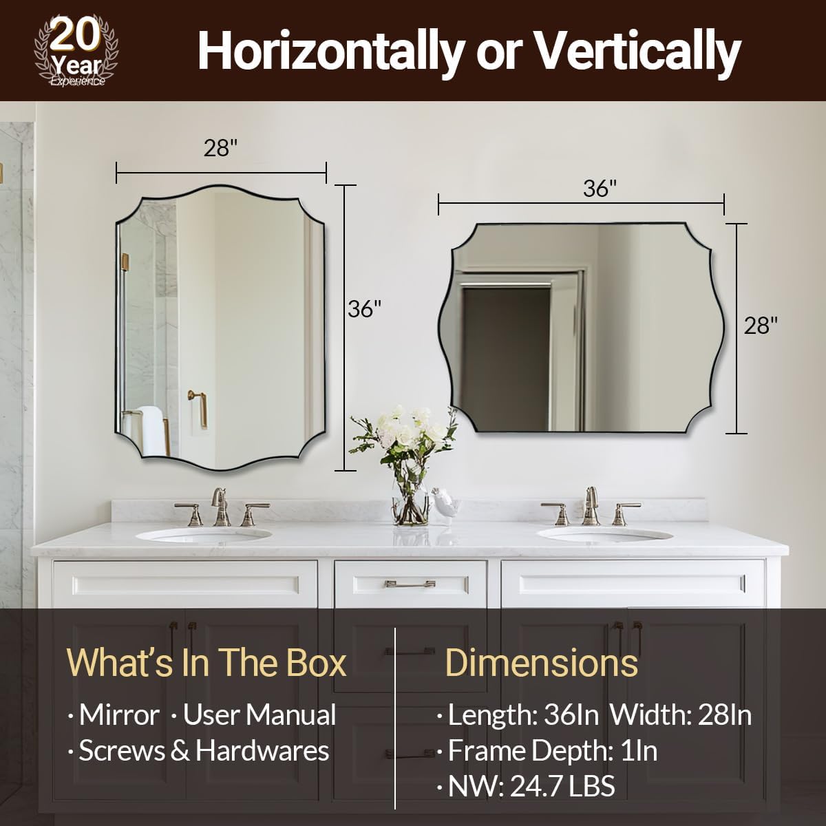 - 【Excellent Packaging & Easy Installation】: This asymmetrical mirror is in fully protected packing with a PE bag, poly foam, and master box to ensure they arrive in perfect condition. Our wall-mounted mirrors pass the 10-point drop test and come with four pre-installed hooks making it easy to install both horizontally or vertically