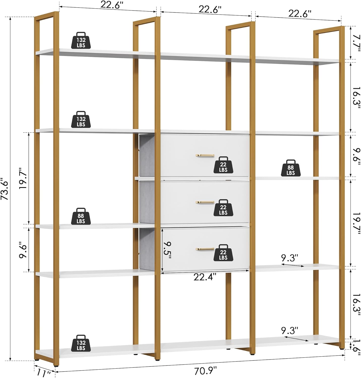 73.6" Tall Bookshelf with 3 Drawers and 16 Storage Shelves, Industrial Bookcase with 16 Open Display Shelves, Large Etagere Bookshelf, Triple Wide Book Shelf Book Case for Home & Office, Gold
