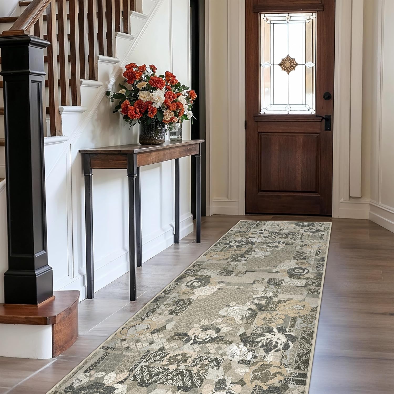 GENIMO Floral Runner Rug 2X6, Machine Washable Non Slip Vintage Patchwork Hallway Runner, Ultra-Thin Low Pile Runners for Indoor Entryway, Hallway, Kitchen and Corridor, Taupe Gray