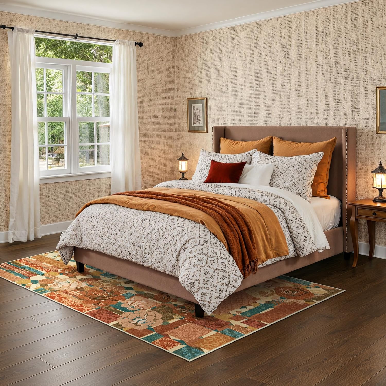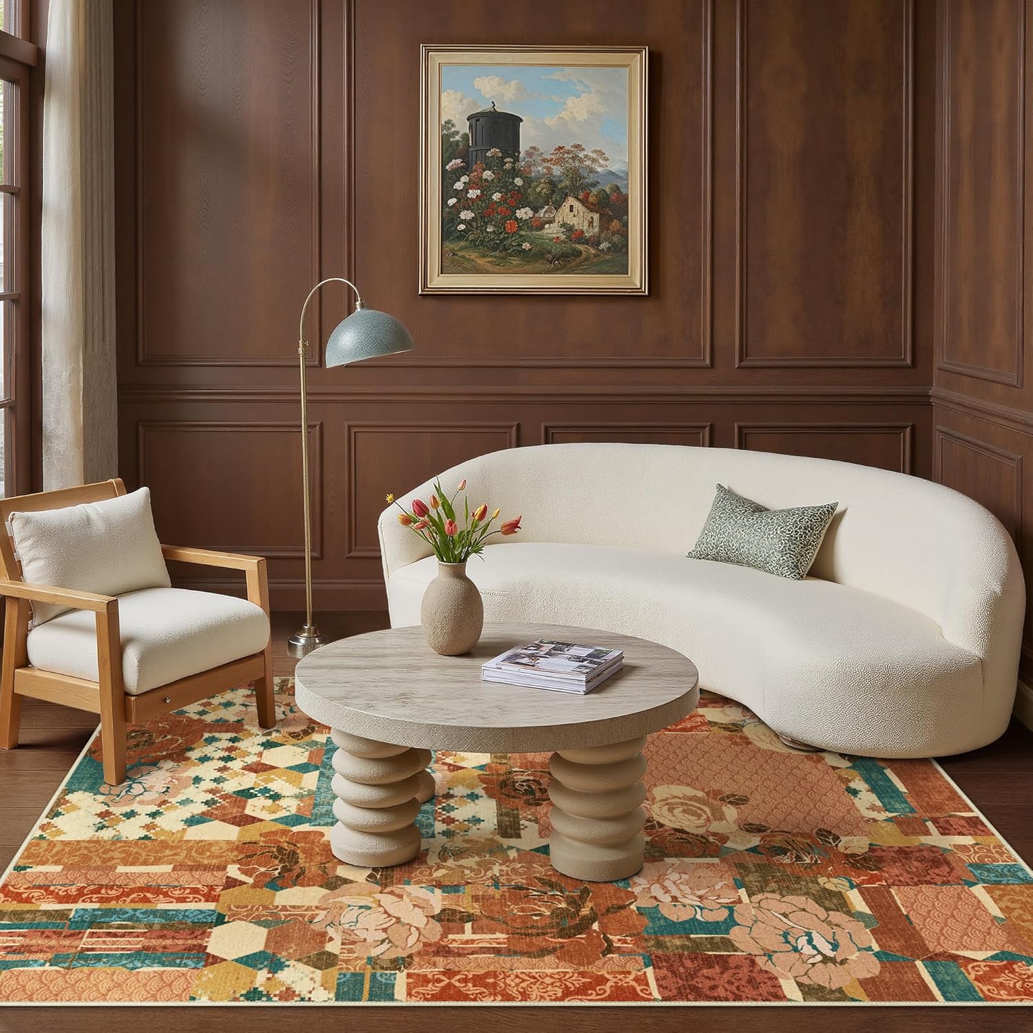 GENIMO 5X7 Floral Area Rugs for Living Room, Machine Washable Non Slip Vintage Patchwork Washable Rug, Ultra-Thin Low Pile Chenille Rugs for Bedroom, Dining Room, Rose Red