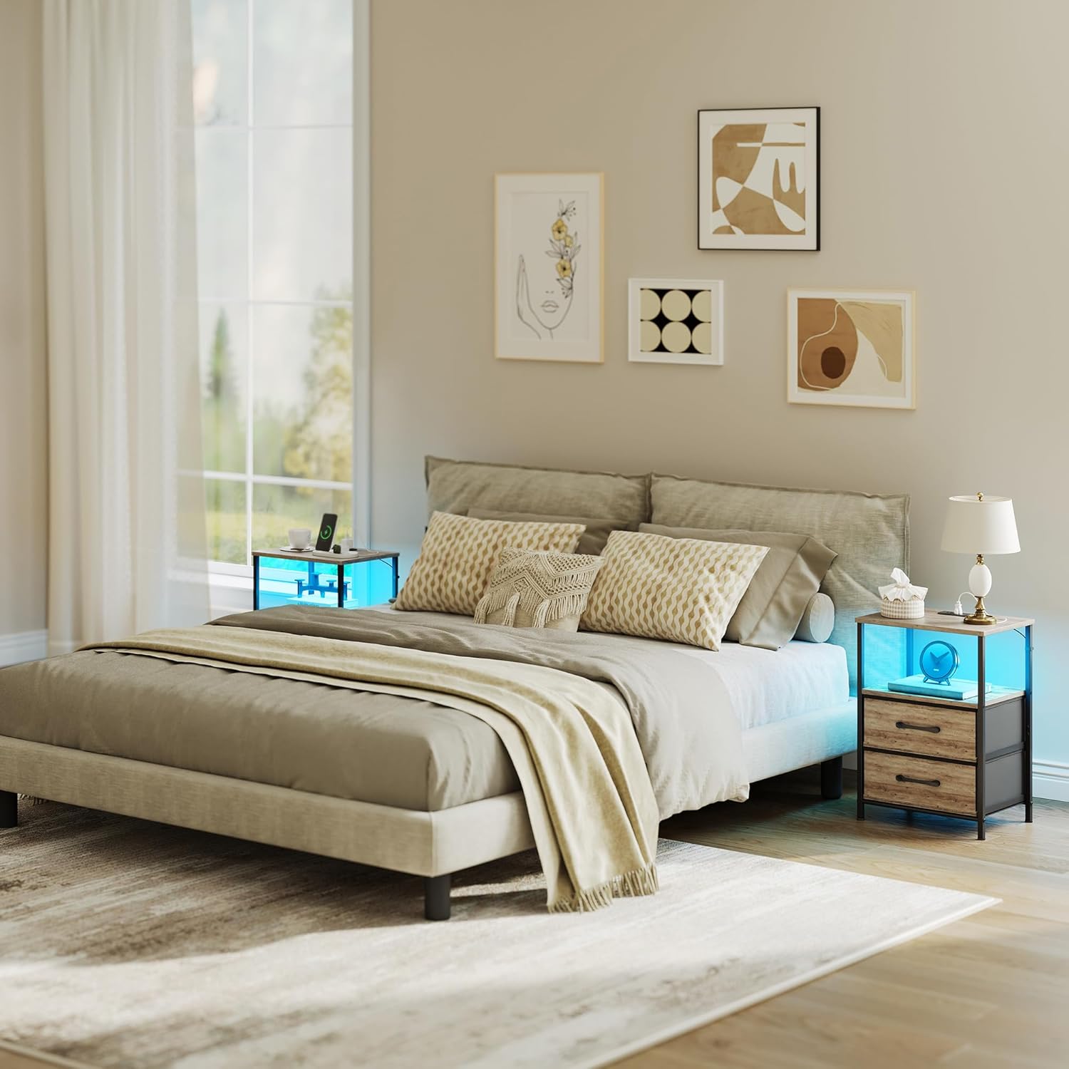 Nightstands Set of 2, Night Stand with Charging Station and Led Lights, Bedside Table with 2 Fabric Drawers for Bedroom, Small Side End Table with Open Shelf, Greige