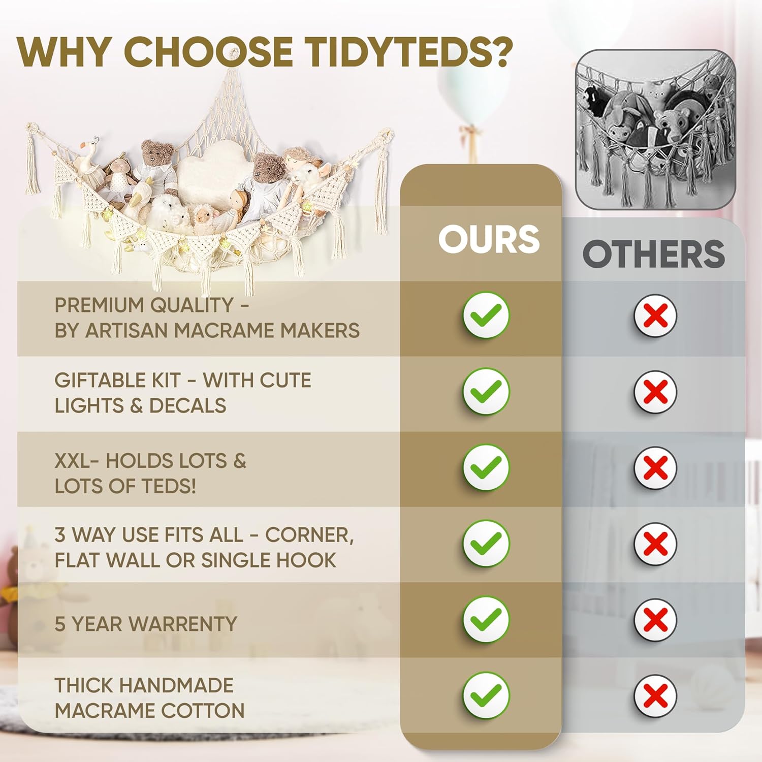 - 🧸 THICK HANDMADE MACRAME COTTON: TIDYTEDS teddy bear hammock is handmade with extra love, strong 4MM Macrame Cord, and gives an option for 5 Way Hanging that stops the sag and that gives it the high-end toy organization and storage aesthetic you were looking for. It makes a lovely luxury baby shower gift, too!