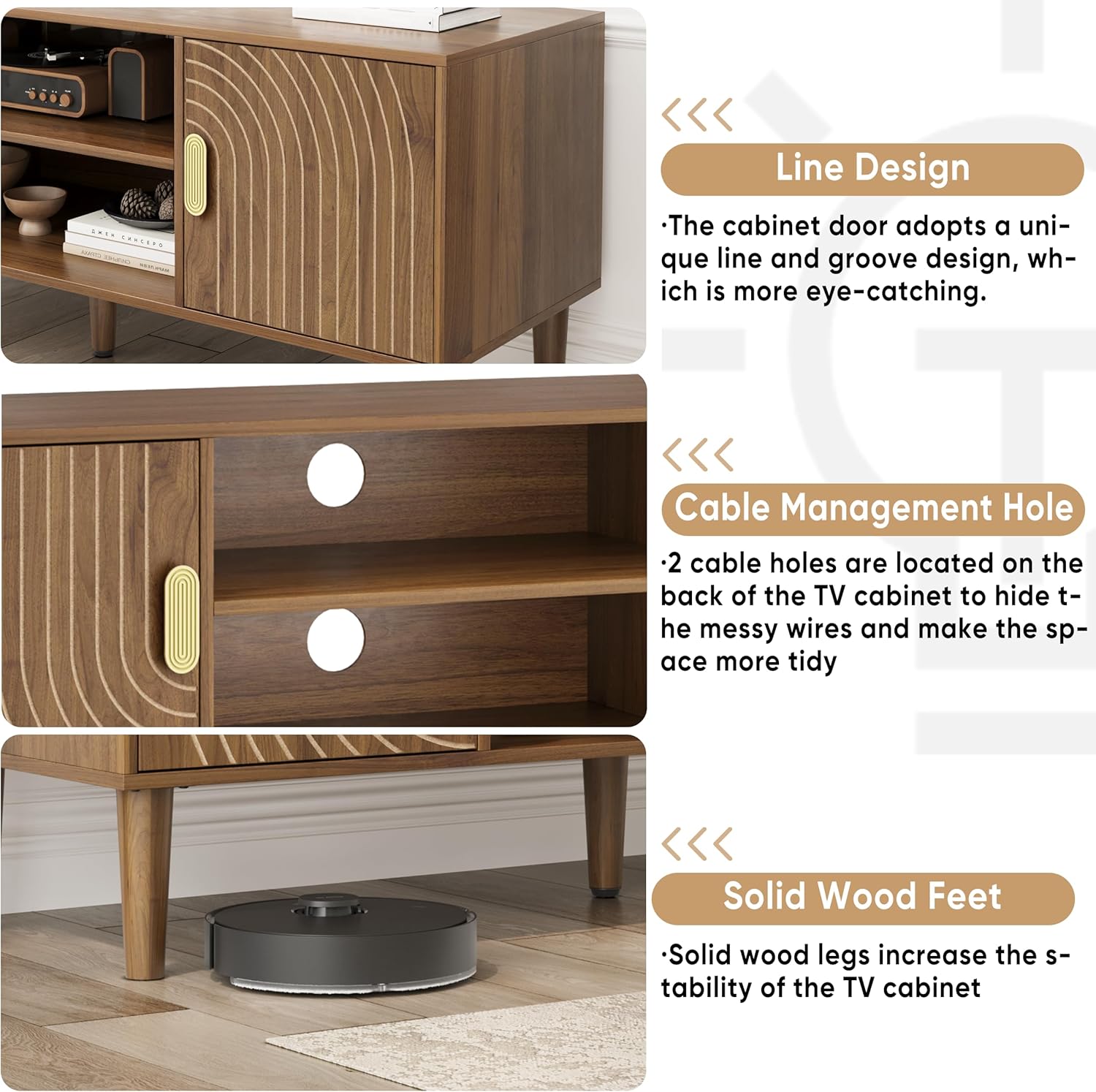 - 【Unique Design】This TV stand adopts the design element of line grooves. The special production process makes the door with line groove elements look unique and beautiful as a whole. The walnut wood board combined with the unique golden handle perfectly blends the mid-century style with modernity. It can be applied to any scene.