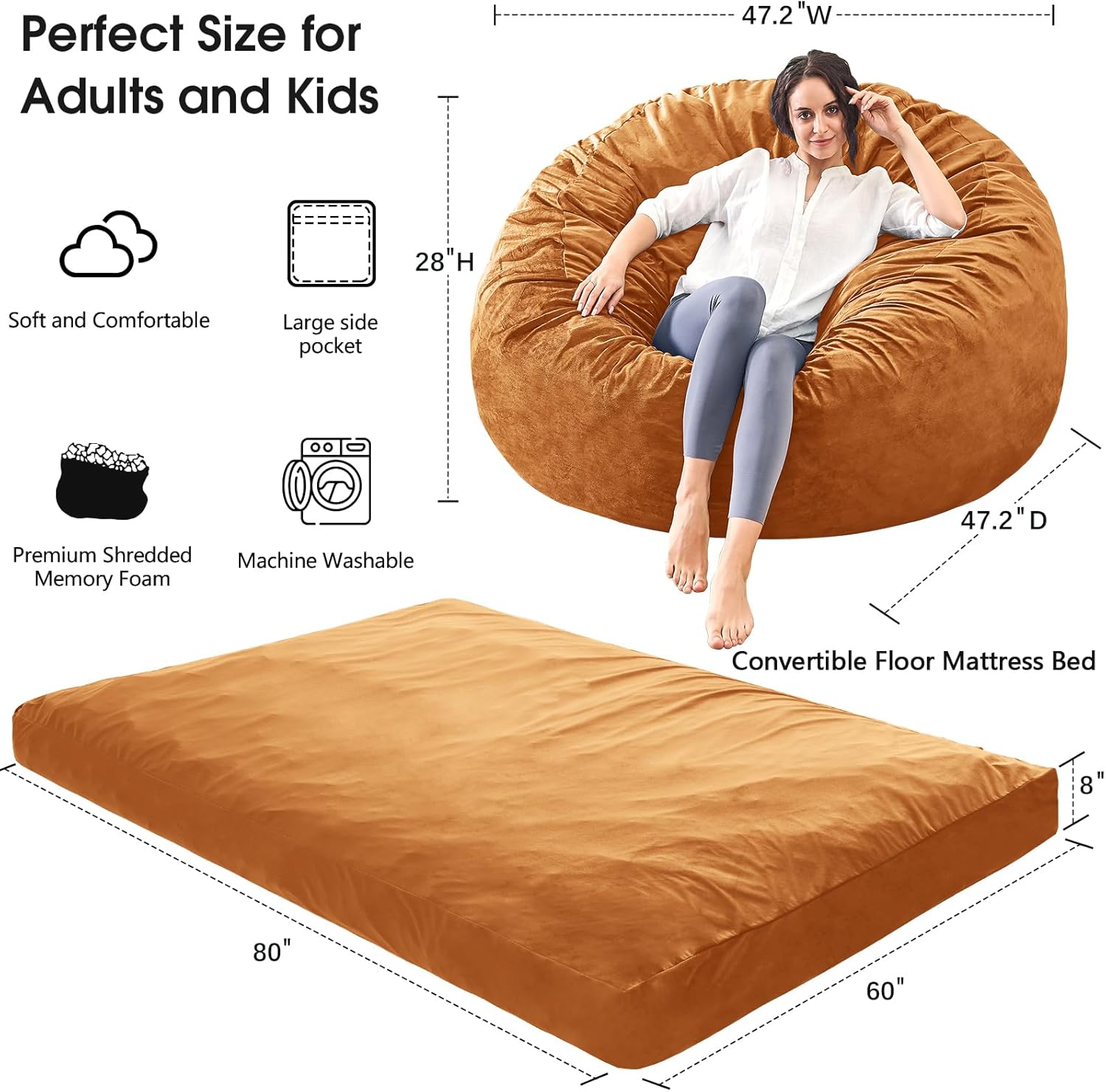 Bean Bag Chairs for Adults - Giant Bean Bag Chair Convertible Bean Bag Bed - Beanbag Chair with Micro Fiber Cover/Furniture Foam Filler - Floor Couch Sofa in Bedroom Dorm Room - Queen Golden Brown